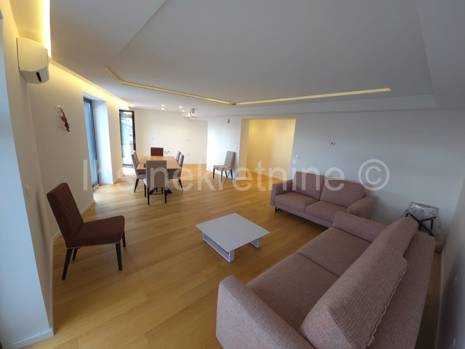 Prodaje se stan od 117.68 m2, 3S+DB, s velikom terasom s pogledom na more, parkirnim mjestom u garaži, u luksuznoj novogradnji na odličnoj lokaciji! Stan se nalazi u suterenu atraktivne novogradnje svega par minuta pješice udaljenoj od mora, plaže i svih sadržaja a isto tako i par minuta pješice od šumske šetnice Carmen Sylve.Stan je djelomično namješten: u dnevnom boravku nalaze se dvije sjedeće garniture i blagovaonski stol, te u svakoj od tri spavaće sobe bračni kreveti s madracima. Svaka spavaća soba ima svoju kupaonicu, a postoji i gostinski toalet kod ulaza u stan.Stan ima dizalicu topline kao glavni izvor grijanja (svaka prostorija ima svoj termostat), a tu su i klima uređaji za sustav hlađenja i grijanja. Od opreme, stan ima kvalitetan parket i kvalitetnu keramiku. Terasa je prostrana, s pogledom na more, a ima dovoljno mjesta i za instalaciju jacuzzija.Atraktivna nekretnina na traženoj lokaciji!
