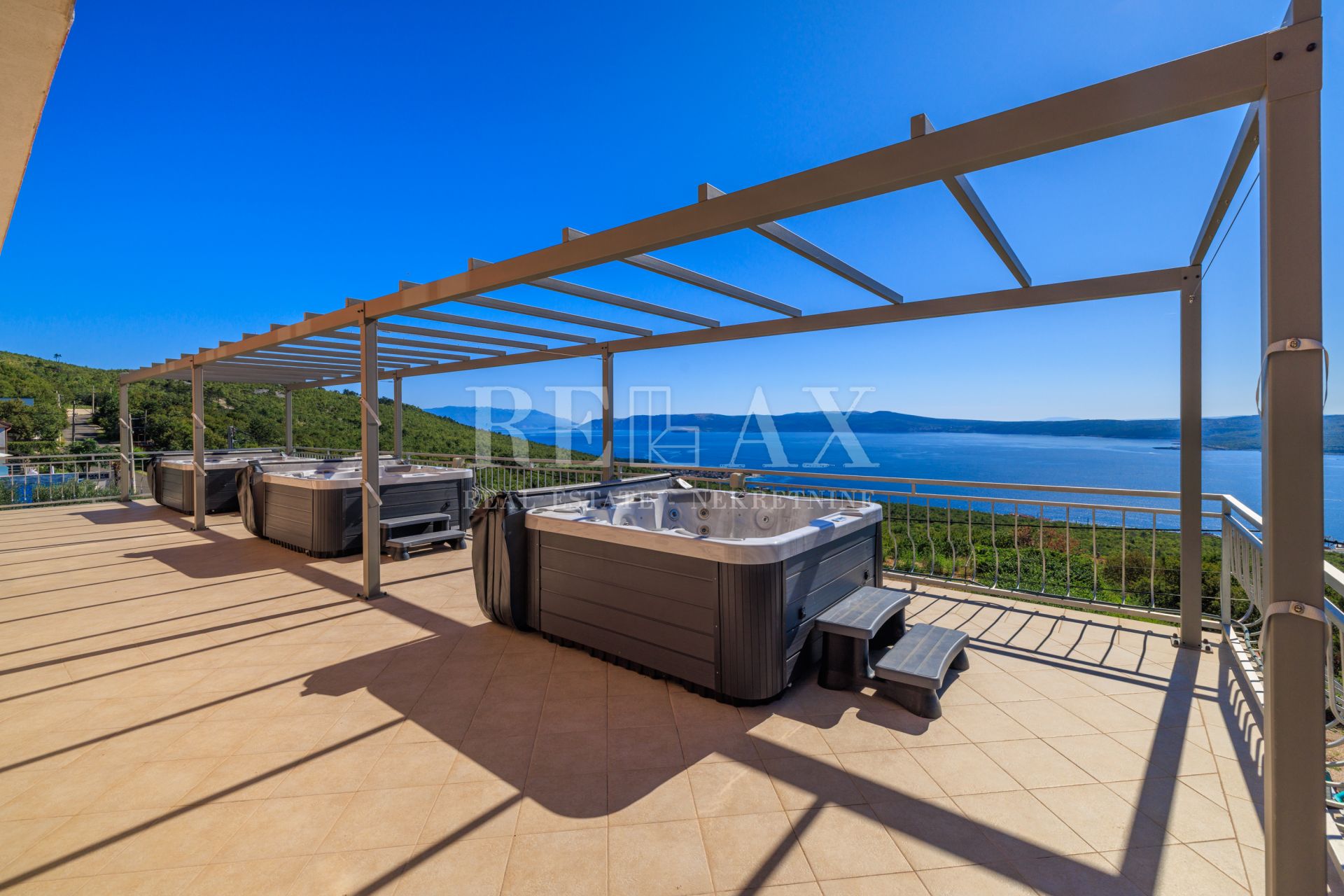 Glavna kuća površine 465 m² sastoji se od tri troetažna stana. Svaki stan obuhvaća suteren, prizemlje i kat, a uključuje četiri spavaće sobe, dnevni boravak, kuhinju, tri kupaonice te tri terase s pogledom na more. Na najvišoj terasi nalazi se natkriveni prostor s jacuzzijem – idealan za opuštanje uz zalazak sunca i pogled prema pučini.