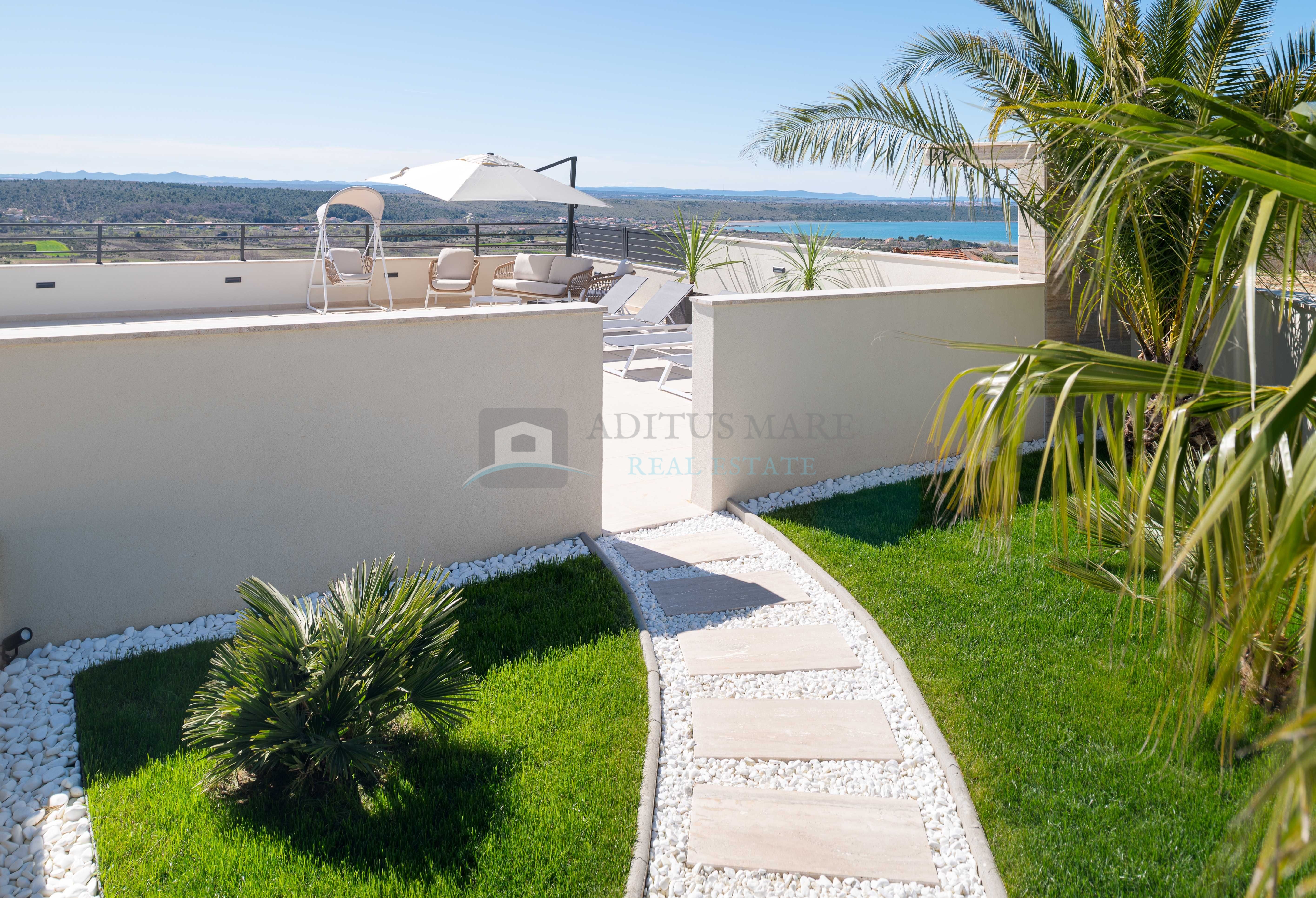 Na impresivnoj lokaciji na vrhu brda, gdje se pogled proteže nesmetano prema horizontu, smještena je ova izuzetna vila koja redefinira pojam luksuznog življenja. Ova suvremena rezidencija prostire se na dvije etaže – prizemlje i prvi kat – te kulminira raskošnom krovnom terasom s jacuzzijem i pripremom za saunu, pružajući ekskluzivan prostor za privatni wellness pod vedrim nebom.