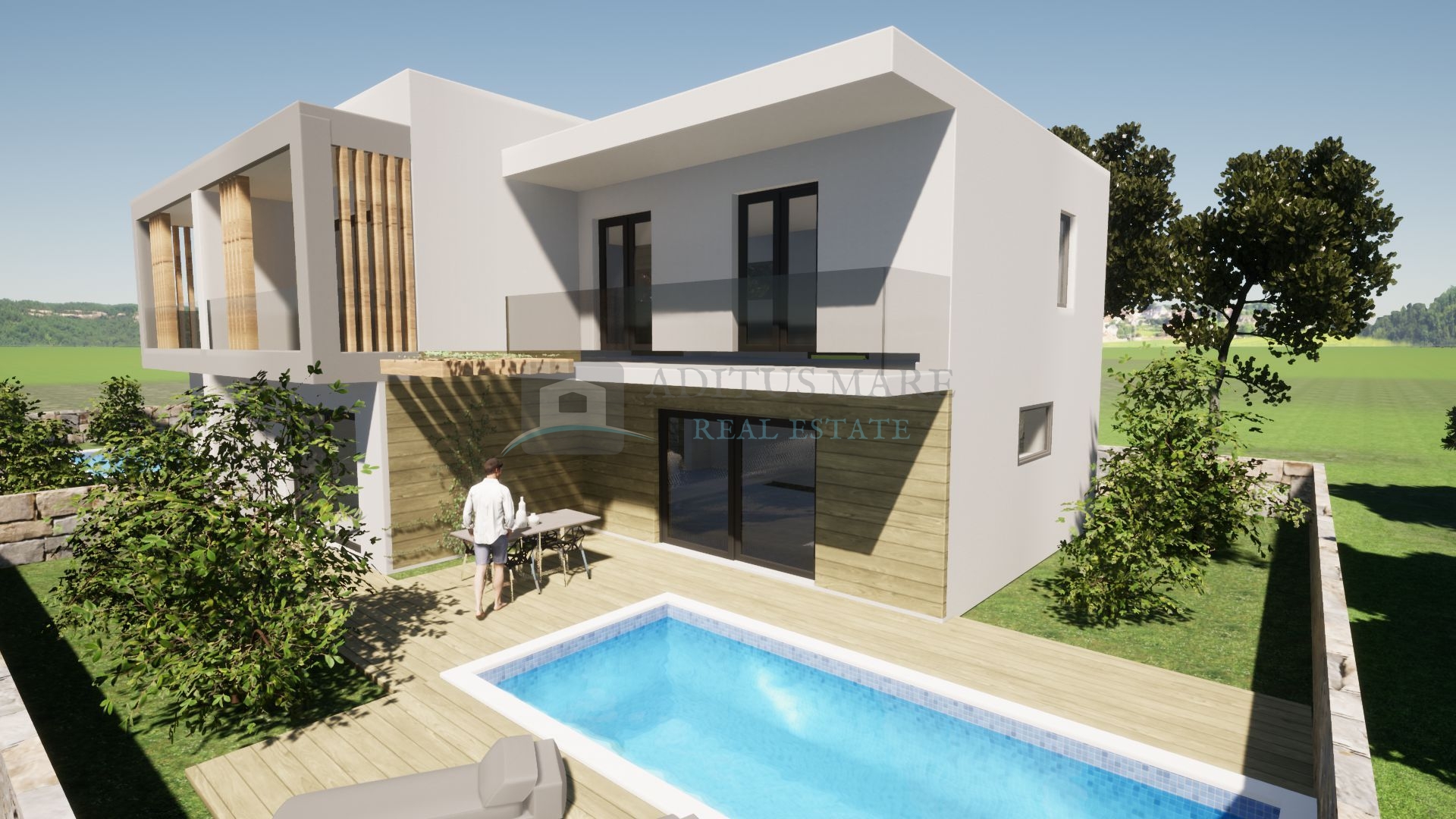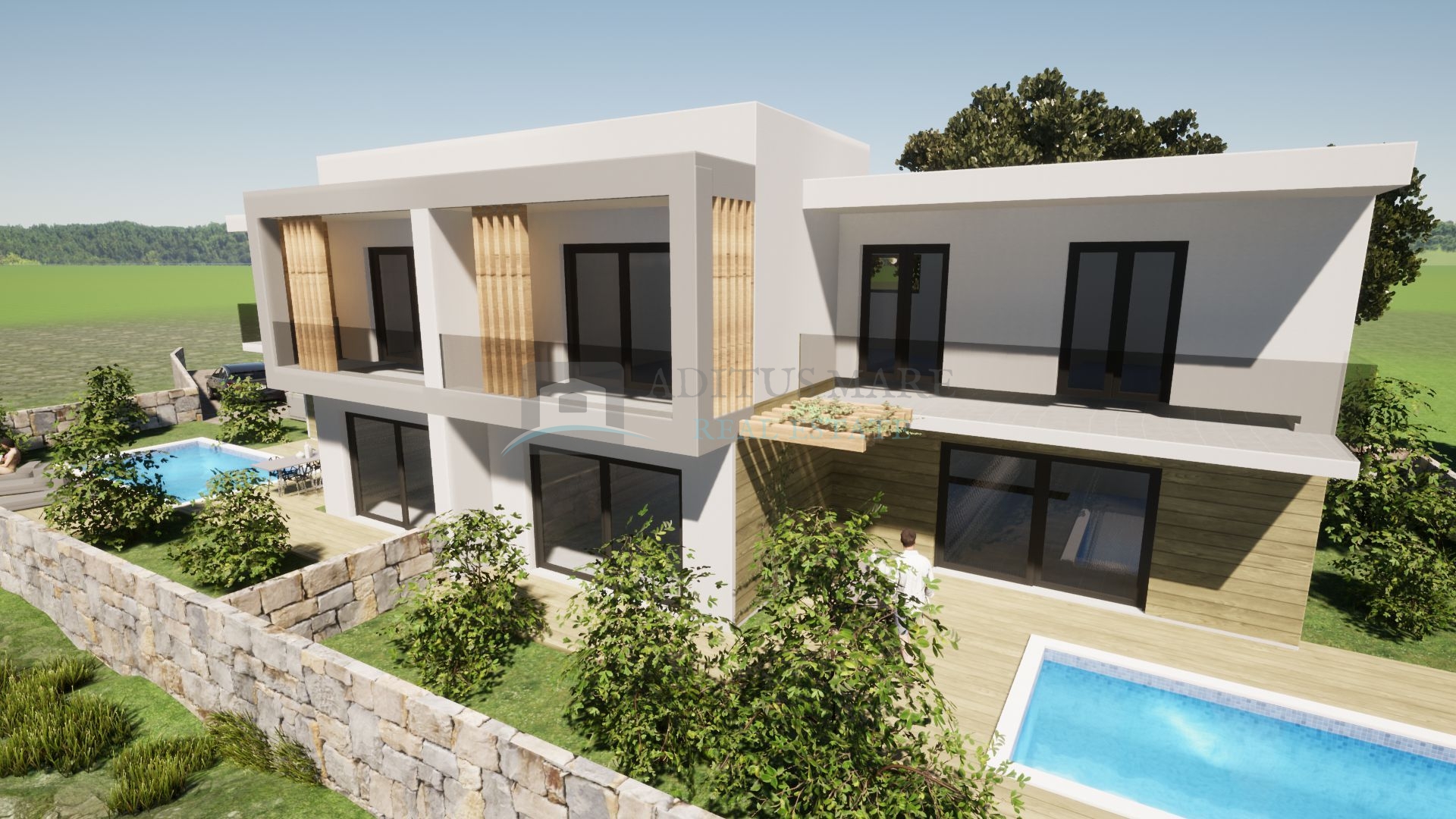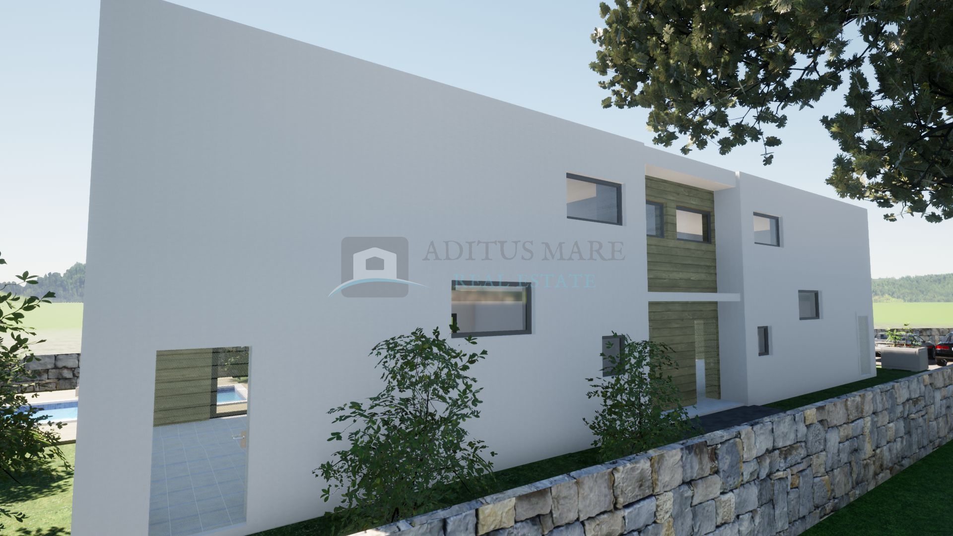 Okućnica kuće će biti uređena, parkirna mjesta popločana, bazen dovršen.