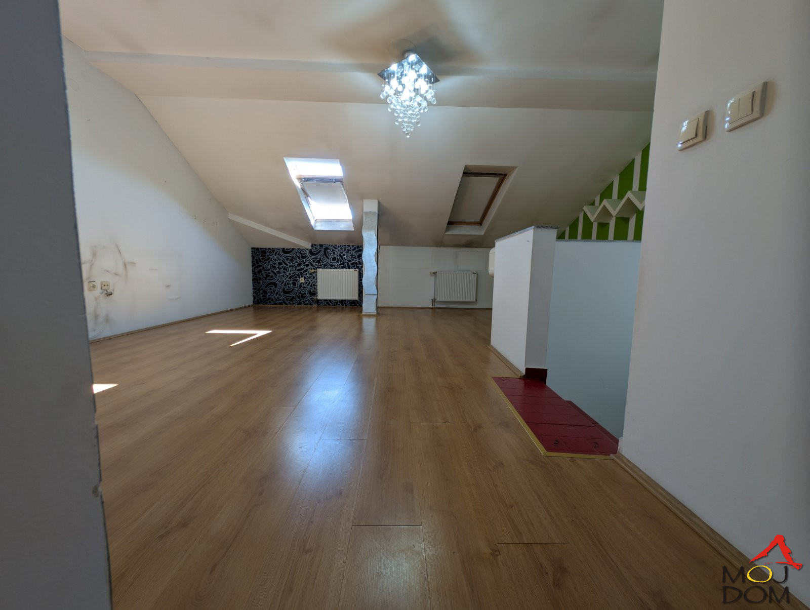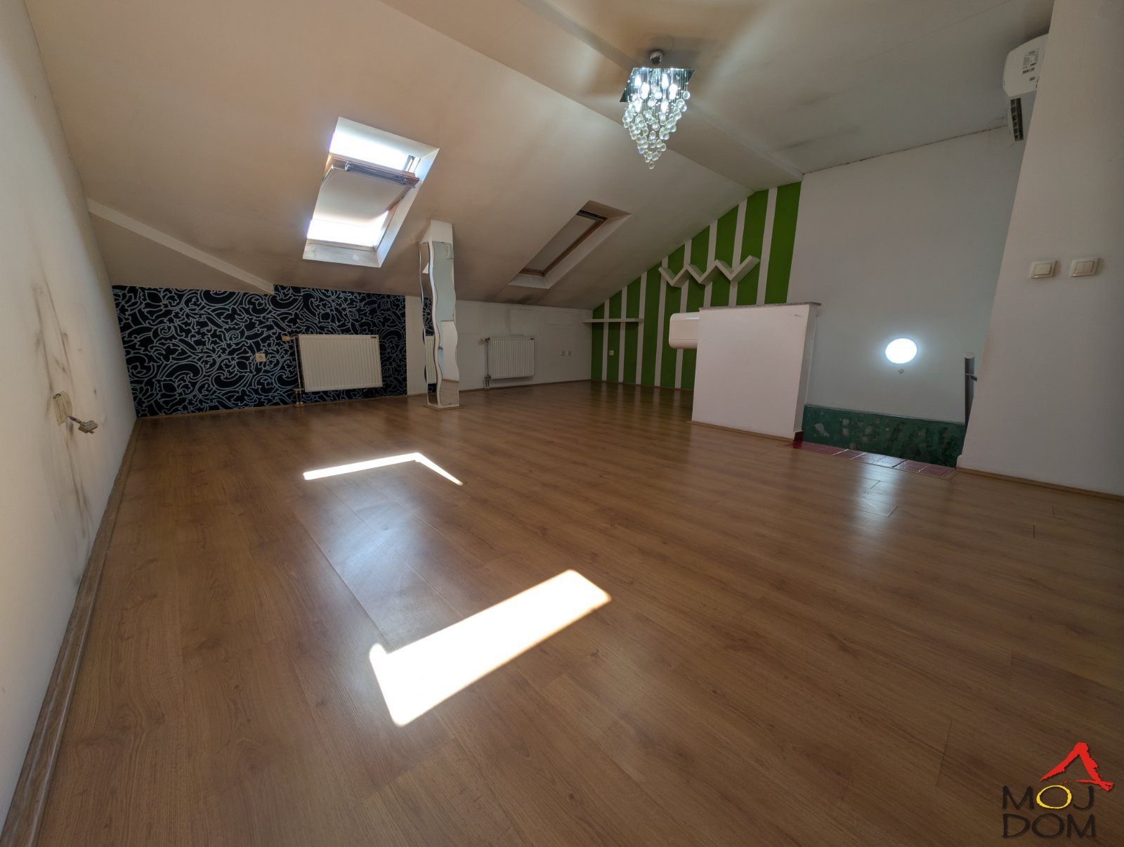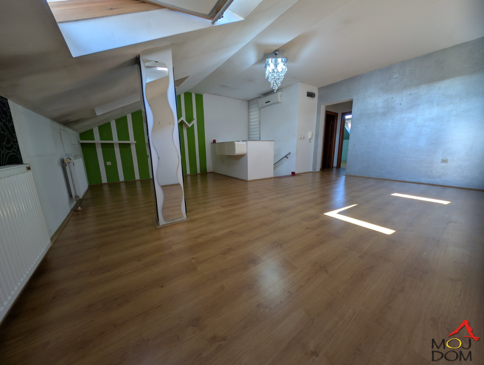 Raspolaže sa 78 m² uknjižene površine i ukupno 85 m² podne površine, čime su kosine svedene na minimum i iskorišćenost prostora maksimalna. Stan je trosoban a postoji mogućnost da se prepravi u funkcionalan četvorosoban. Donji nivo čine kuhinja sa trpezarijom i toalet, dok gornju etažu krasi izuzetno svetao dnevni boravak velikih dimenzija, dve dodatne prostorije od kojih je jedna korišćena kao garderober, i prostrano kupatilo.