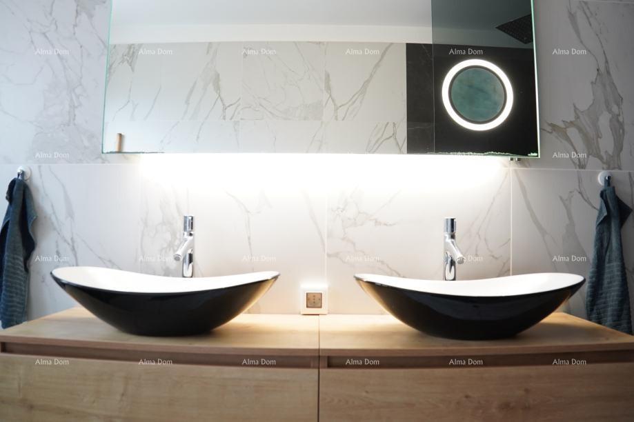 Opis: Prodaje se potpuno namješten, stan površine 120 m² na 1. katu kuće s ukupno dvije stambene jedinice. Stan se sastoji od hodnika, kuhinje, dnevnog boravka, 2 spavaće sobe, kupaone, terase. Stan ima vlastiti vrt površine 200 m².