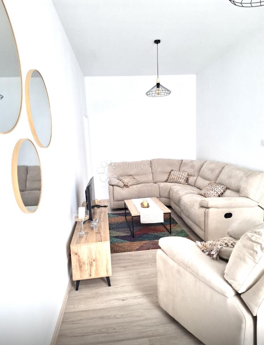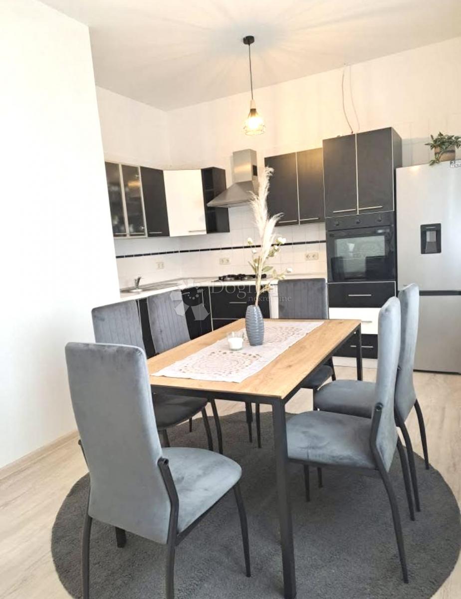 Interijer stana uređen je u toplim nijansama šampanjca, uz pažljivo birane moderne detalje koji stvaraju ugodnu i elegantnu atmosferu. Prostor je svijetao i prozračan i funkcionalne tlocrtne dispozicije. Velika blagovaonica povezana je s kuhinjom, u sofisticiranoj kombinaciji sivih i bijelih tonova te i elemenata, dok prostrani dnevni boravak nudi dovoljno mjesta za opuštanje a može služiti i kao radni prostor. Zidna dekoracija u obliku okruglih ogledala vizualno povećava prostor, a decentna rasvjeta dodatno naglašava moderan dizajn.