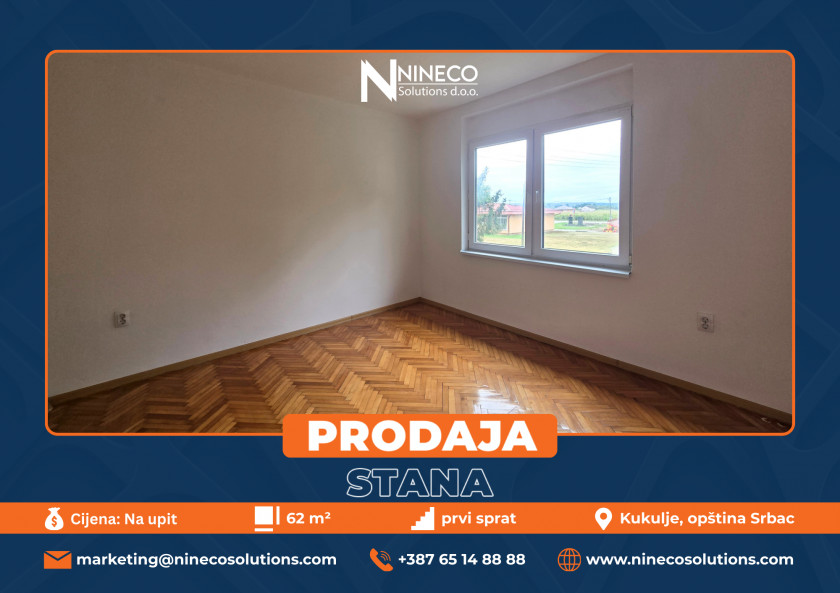 Na prodaju stan površine 62 m², smješten na prvom spratu stambene zgrade u naselju Kukulje, opština Srbac.