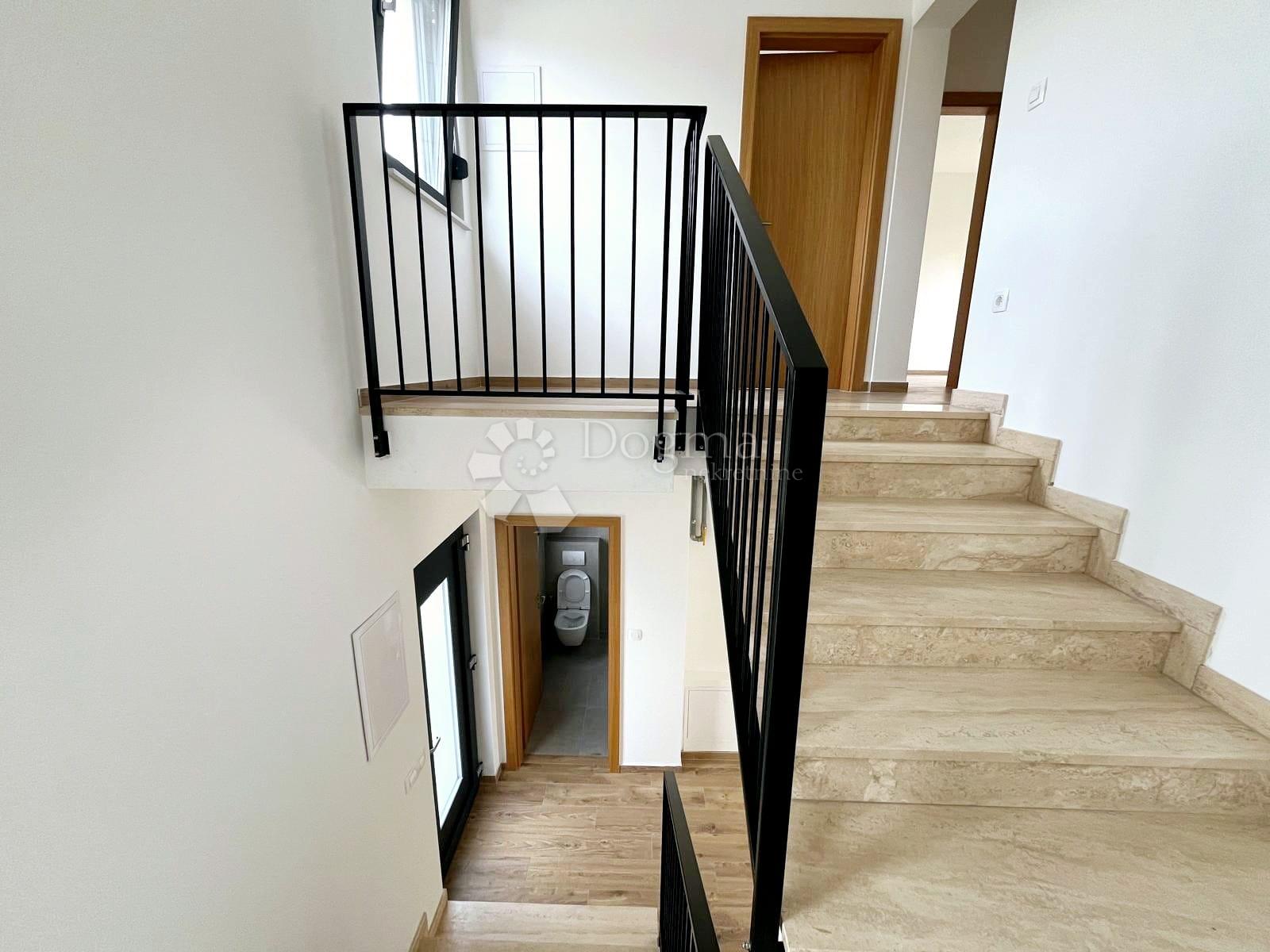 Donja etaža otvorenog koncepta obuhvaća prostrani dnevni boravak s izlazom na terasu i vrt od približno 100 m², što osigurava visoku razinu privatnosti i mir za svakodnevno opuštanje. Uz dnevni dio smještena je kuhinja, ostava i dodatni toalet. Unutarnje stubište, elegantno obloženo kamenom, vodi na gornju etažu gdje se nalaze tri udobne spavaće sobe i moderno uređena kupaonica.