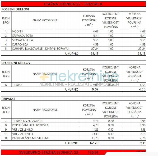 Stan S2 ima sveukupnu površinu od 126,91 m² (obračunski 68,78 m²), a sastoji se od: