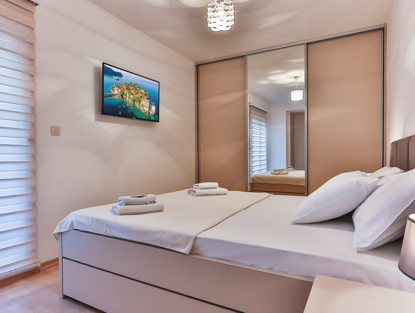 Stan je u potpunosti opremljen svim neopdhonostima za ugodan boravak i namešten sa modernim nameštajem. Takodje, ima bocni pogled na more.