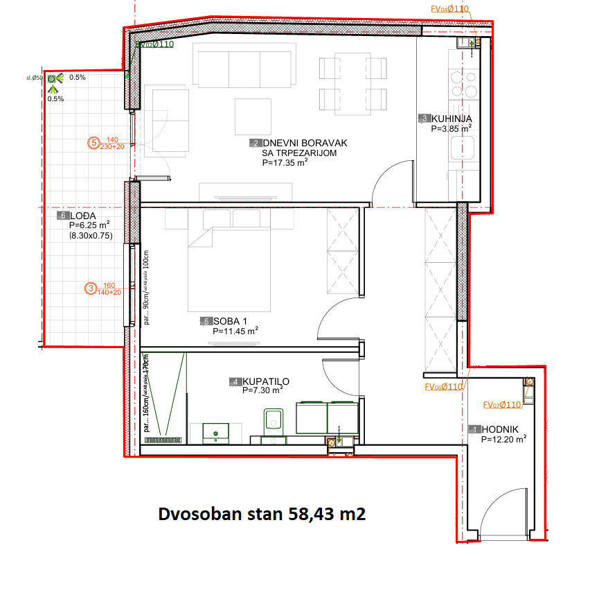 Prodaje se dvosoban stan u izgradnji ukupne površine 58,43 m2 na VI sprat stambeno poslovnog objekta “SAND CITY” koji će da posjeduje lift.