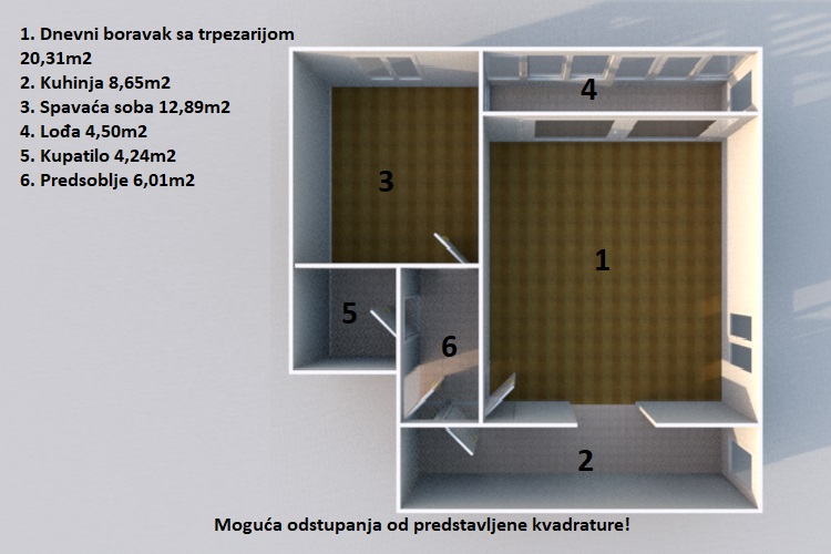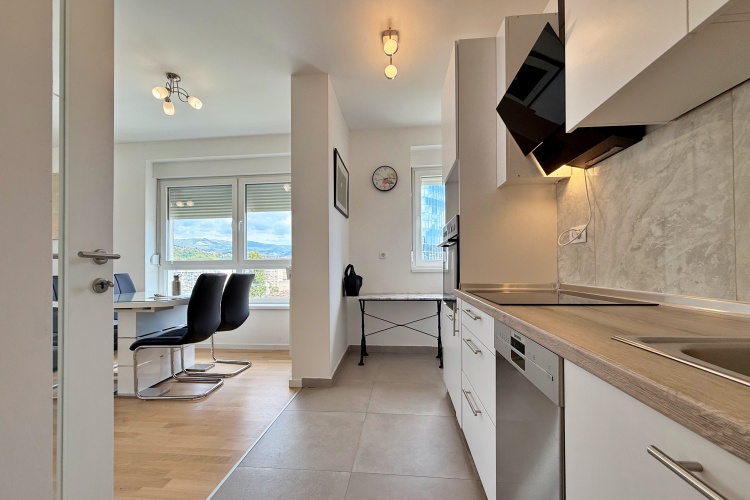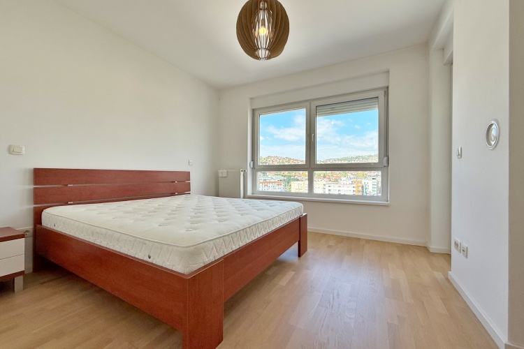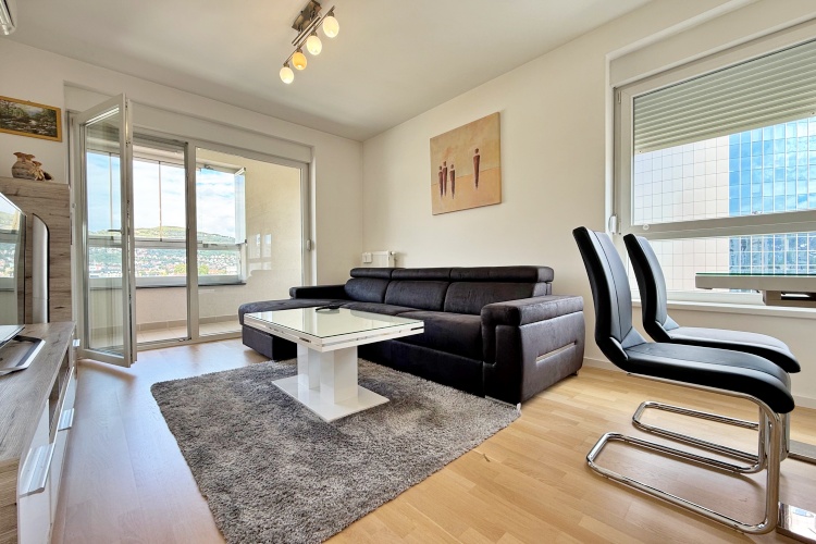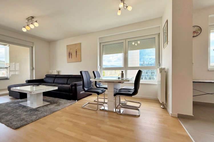 Opis: Iznajmljujemo svijetao i lijepo uređen, dvosoban stan površine 55,48m2 koji se nalazi na devetom spratu stambeno – poslovne zgrade novije gradnje (2021), u naselju Otoka. Stan se sastoji od dnevnog boravka sa kuhinjom i trpezarijom, jedne spavaće sobe, kupatila, predsoblja i lođe kojoj se može pristupiti iz dnevnog boravka i spavaće sobe. Posjeduje velike prozorske otvore, zbog čega je u kombinaciji sa dvostranom orijentacijom i visokom spratnošću prozračan, svijetao i vrlo ugodan za boravak. Visoki stropovi – min. 2,80m te nestandardna unutrašnja stolarija ovom stanu daju poseban efekat i čineći ga vrlo raskošnim. Pored činjenice da se radi o moderno uređenom/novom stanu, posebna karakteristika ove nekretnine je odlična lokacija. Otoka je geografski centar grada, a sam stan je u središtu svih sadržaja potrebnih za kvalitetan svakodnevni način života.