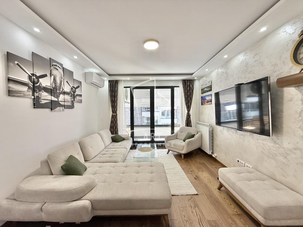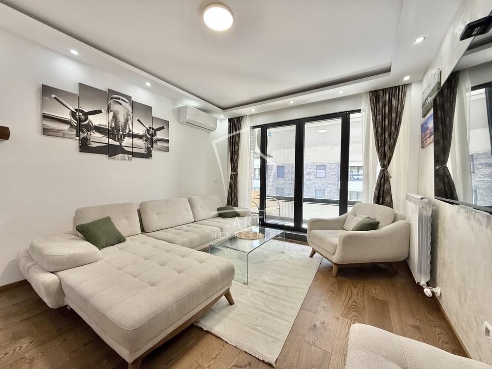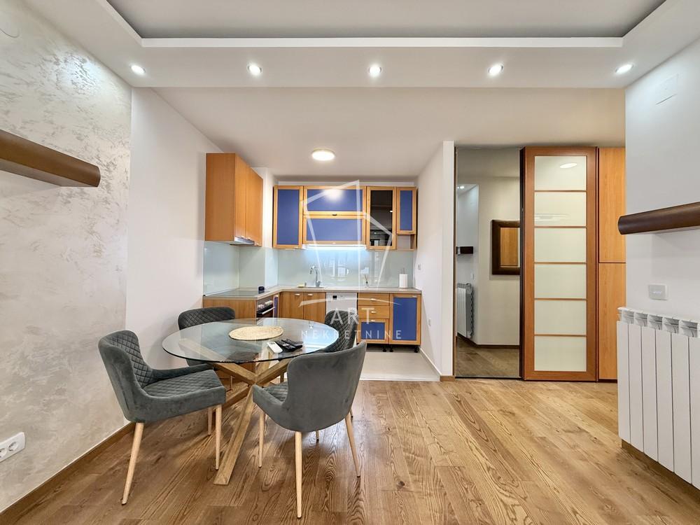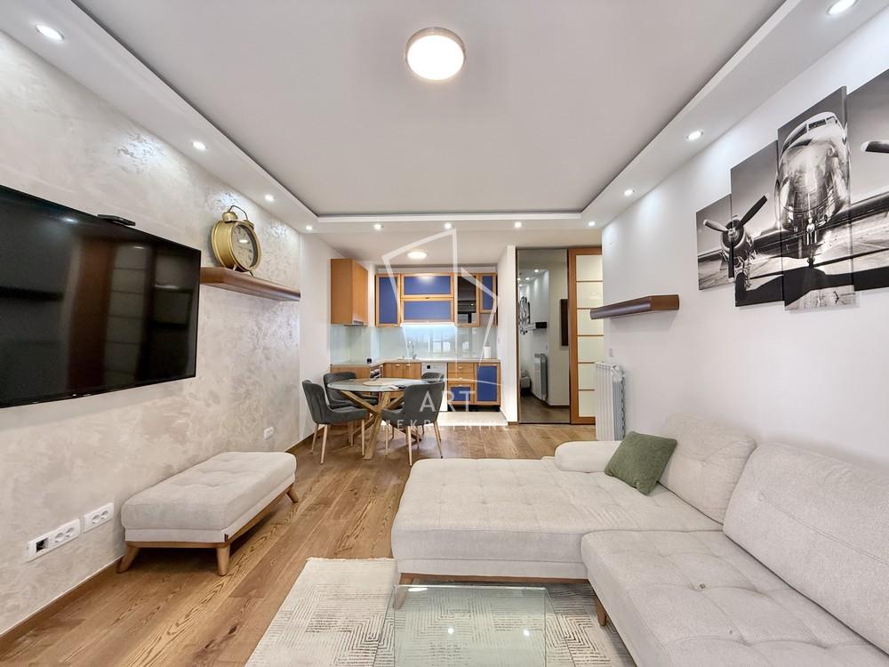 Stan se sastoji iz velikog dnevnog boravka sa kuhinjsko-trpezarijskim delom, dve spavaće sobe, od kojih je jedna opremljena, a druga prazna i oprema se po želji i potrebi budućeg zakupca, ostave i kupatila.
