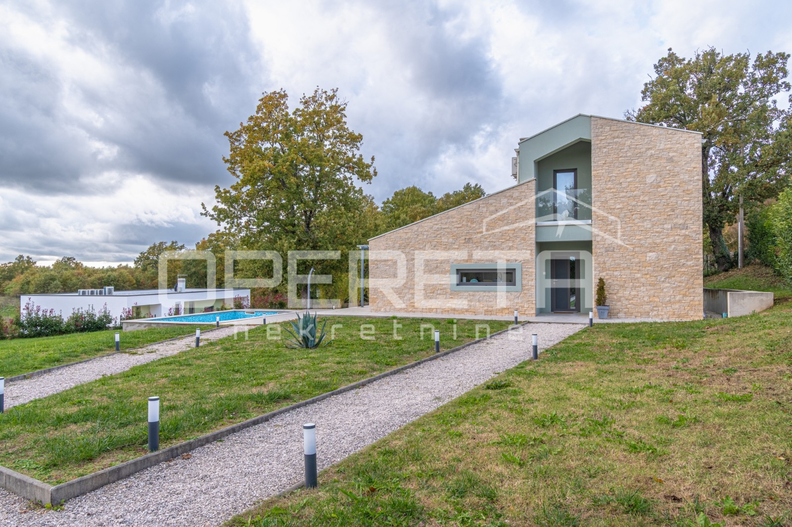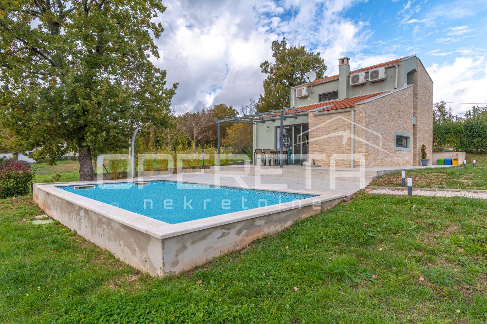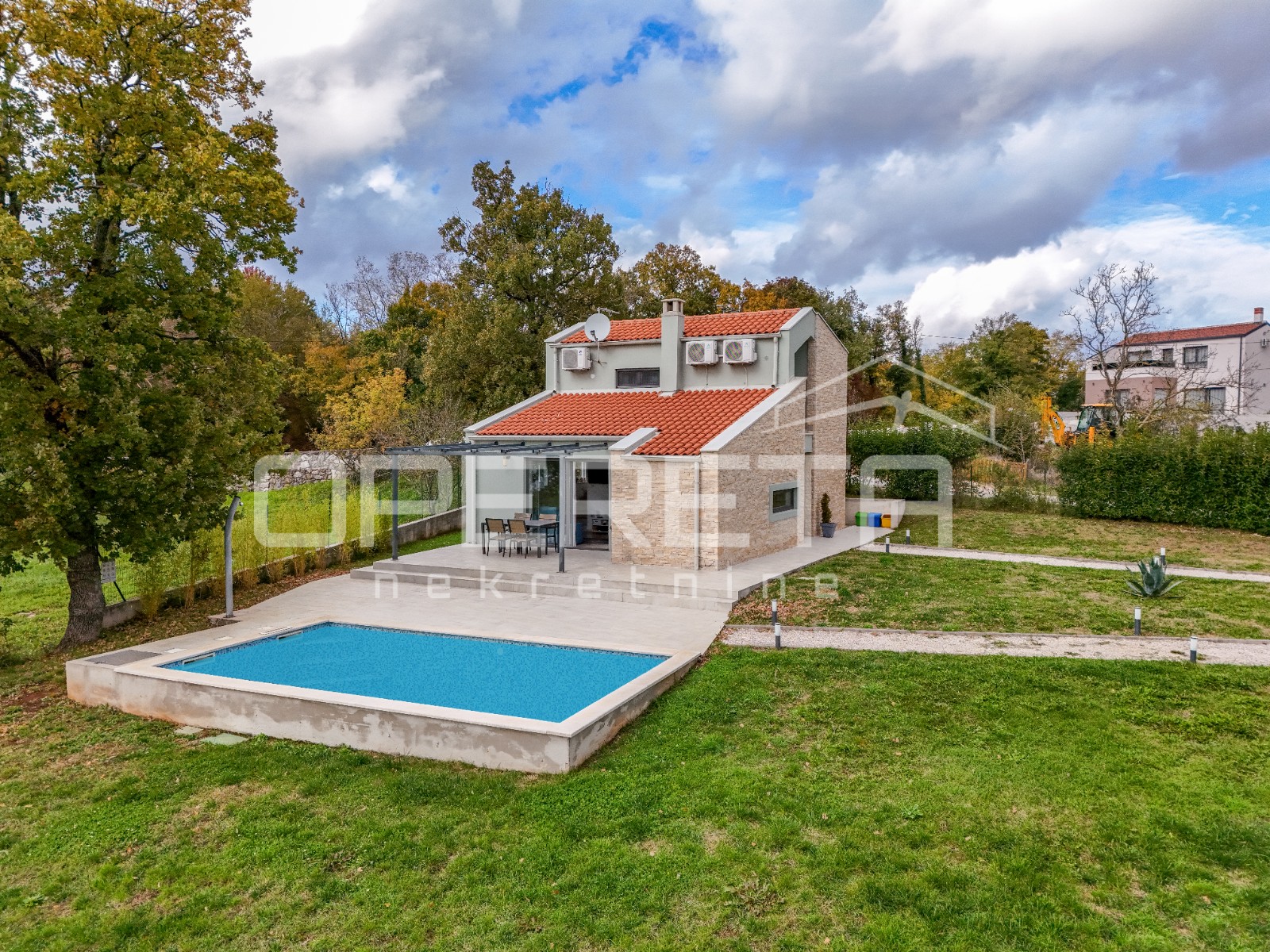 Opis: U mirnom istarskom mjestu, nedaleko Svetog Petra u Šumi, daleko od gradske gužve, prodaje se ova kuća od 81 m² smještena je na rubu šume, na parceli od 781 m². Nudi potpuni mir te prekrasan pogled na prirodu. Kuća je stvorena za opuštanje: u prizemlju se nalazi prostrani dnevni boravak s izlazom na natkrivenu terasu, potpuno opremljena kuhinja, blagovaonica te spavaća soba s kupaonicom. Na katu je još jedna spavaća soba s vlastitom kupaonicom i lođom. Prirodni materijali poput kamena i drva daju prostoru toplinu i ugodu. Za grijanje i hlađenje koriste se klima uređaji i električno centralno grijanje, a tu je i kamin za poseban ugođaj.Uređeno dvorište s bazenom, natkrivenom terasom i roštiljem idealno je za uživanje u ljetnim mjesecima i druženja s obitelji i prijateljima.