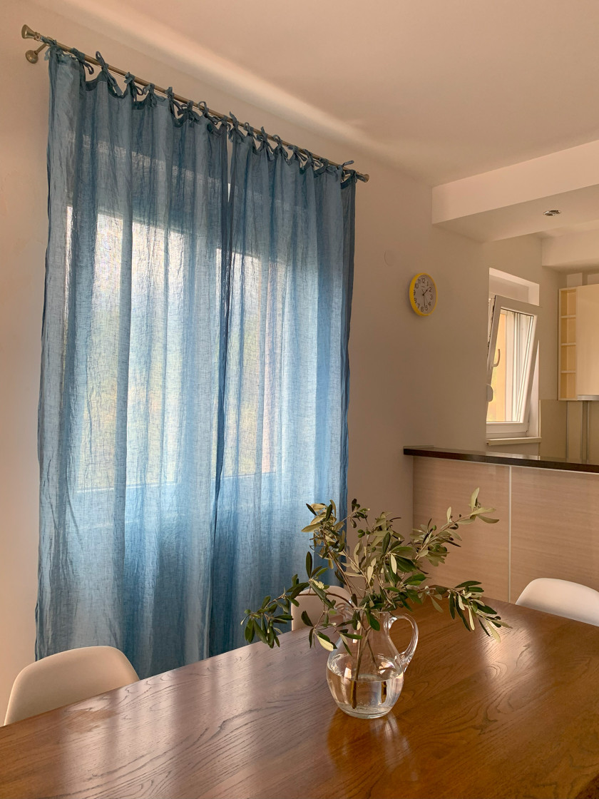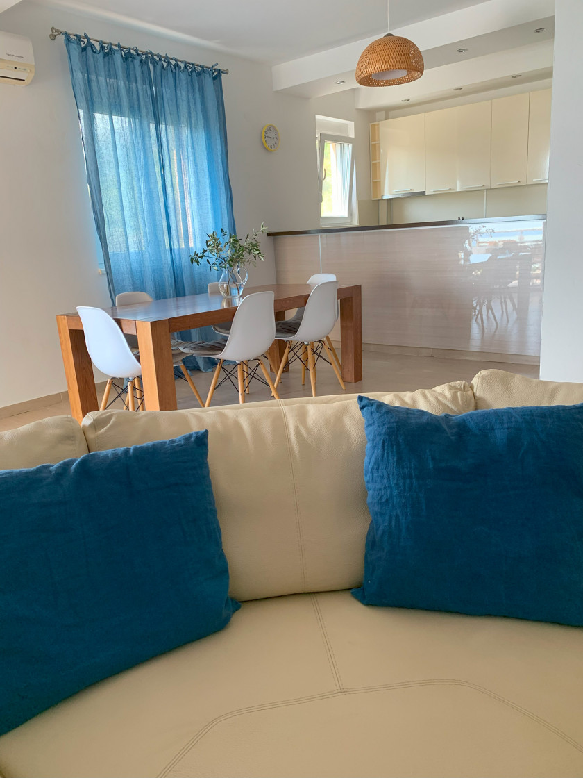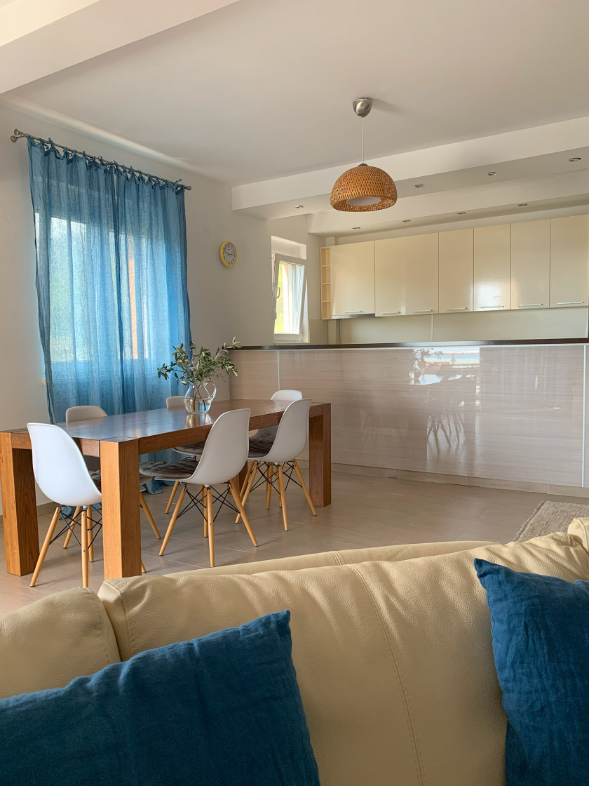 Struktura: hodnik, dnevna soba, kuhinja, trpezarija, tri spavaće sobe, dva kupatila, terasa sa pogledom na more.