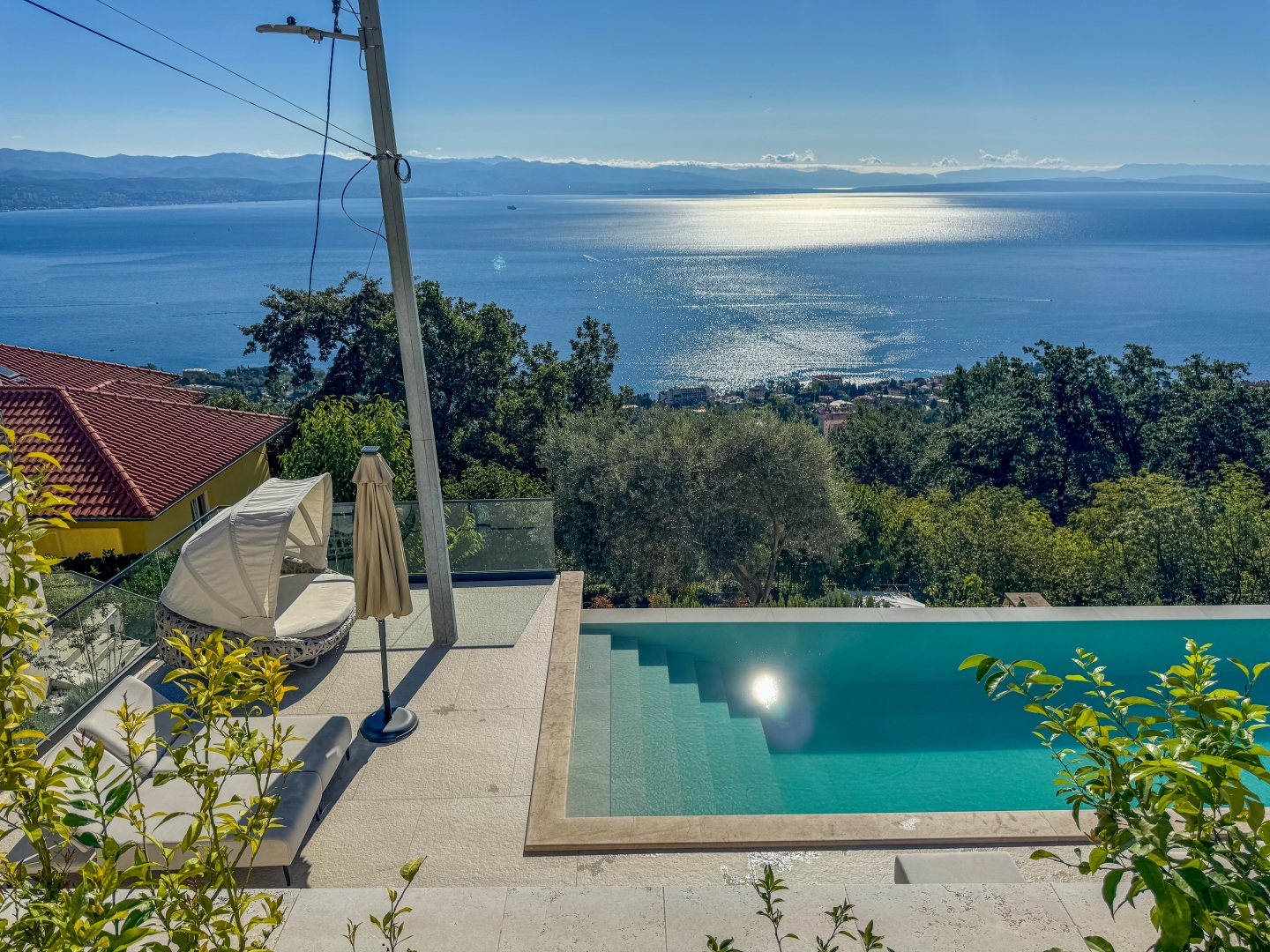 Opis (Engleski): Opatija – Lovran: Modern Sea-View Apartment with Terrace and Shared PoolDiscover this beautifully furnished apartment with a panoramic view of the Kvarner Bay, located in a quiet and sought-after residential area just above Lovran, minutes from Opatija and the Adriatic coast.Positioned in an exclusive boutique complex with a shared swimming pool, this south-facing apartment offers the perfect balance of modern living, vacation comfort, and scenic surroundings—ideal for both permanent residence and profitable tourist rental.The interior features an open-plan living room, kitchen, and dining area, two bright bedrooms, a bathroom, and an additional guest toilet. One of the highlights of the property is the spacious terrace covered with a stylish pergola, offering stunning sea views and a perfect space for outdoor relaxation or entertaining.Sold fully furnished and equipped, the apartment is move-in ready and optimized for immediate use or rental income....