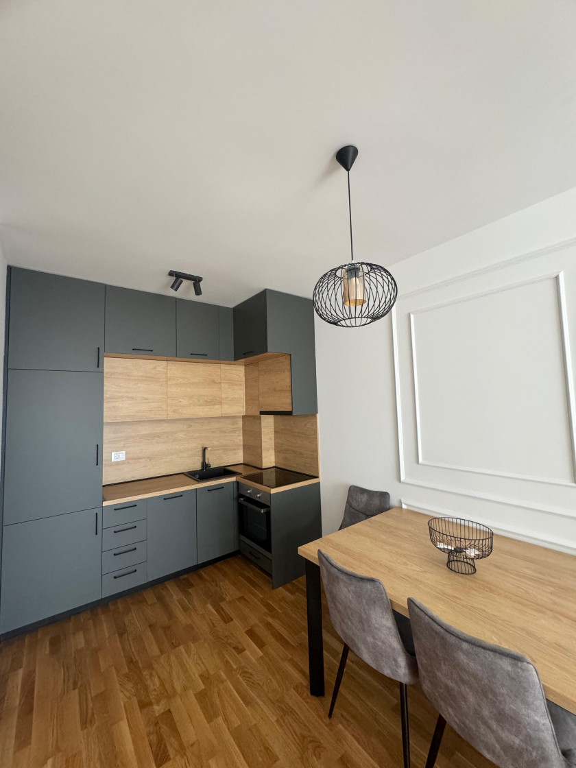Dnevni boravak sa moderno opremljenom kuhinjom koja ima pored šporeta sa rernom, kombinovani frižider sa zamrzivačem I mašinu za pranje suđa. Tu se nalazi I trpezarijski sto sa stolicama.