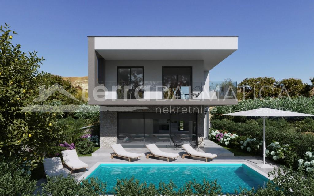 Opis: U srcu Dalmacije, na predivnom otoku Murteru, smjestila se ova luksuzna kuća s bazenom, savršen spoj moderne arhitekture i netaknute prirode. Nalazi se u prvom redu do mora, na samom rubu građevinske zone, što osigurava privatnost i neometani pogled na more. Nekretnine na ovakvim lokacijama prava su rijetkost, a ovo je vaša prilika da ostvarite san o životu uz more. Detalji nekretnine: Površina parcele: 450 m² Bazen: 32 m² Dva privatna parkirna mjesta Stambena površina: 215 m² (bez terasa) Dizajnirana za udobnost i luksuz Očekivani završetak radova: kraj 2025. godine. Prizemlje: Prostrani ulazni dio vodi u dnevni boravak otvorenog koncepta, povezan s blagovaonicom i moderno opremljenom kuhinjom. Velike staklene stijene omogućuju obilje prirodne svjetlosti, stvarajući ugodnu i prozračnu atmosferu. Na ovoj etaži nalaze se i spavaća soba, kupaonica, praonica te spremište od približno 5 m² s vanjskim ulazom. Kat: Tri prostrane spavaće sobe dizajnirane su za maksimalnu udobnost, svaka s vlastitom kupaonicom i izlazom na balkon ili terasu s pogledom na more. Glavna spavaća soba dodatno ima i prostrani garderobni prostor....
