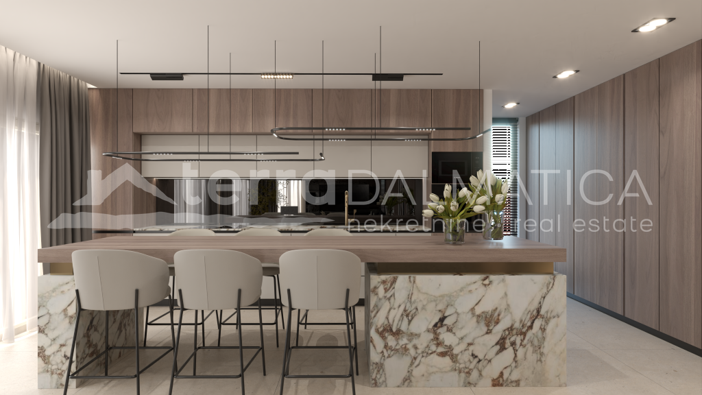 Opis: Na prodaju je luksuzna nekretnina smještena na atraktivnoj lokaciji, s panoramskim pogledom na more. S približno 300 m² korisnog prostora na zemljištu od 600 m², ova kuća pruža sve potrebno za ugodan i luksuzan život. Središnji dio kuće čine dnevni boravak, blagovaonica i moderna kuhinja, dizajnirani u otvorenom konceptu koji nudi prozračan i svijetao prostor idealan za obiteljska okupljanja i opuštanje. Slijedi hodnik koji vodi do gostinjskog toaleta, kupaonice i tri spavaće sobe, od kojih jedna ima i vlastitu kupaonicu. Dodatni sadržaji uključuju teretanu, konobu za uživanje i razonodu, te tehnička soba i vešeraj koji osiguravaju praktičnost i funkcionalnost u svakodnevnom životu. Vanjski prostor kuće oaza je za opuštanje i uživanje na otvorenom. Grijani bazen okružen je terasom savršenom za sunčanje i uživanje u blagodatima mediteranskog načina života. Na raspolaganju je i parking za 3-4 automobila, što dodatno povećava funkcionalnost ove nekretnine. Cijena ove nekretnine u opciji bez namještaja iznosi 1.350.000 eura, dok je cijena namještene kuće prema projektu 1.500.000 eura....