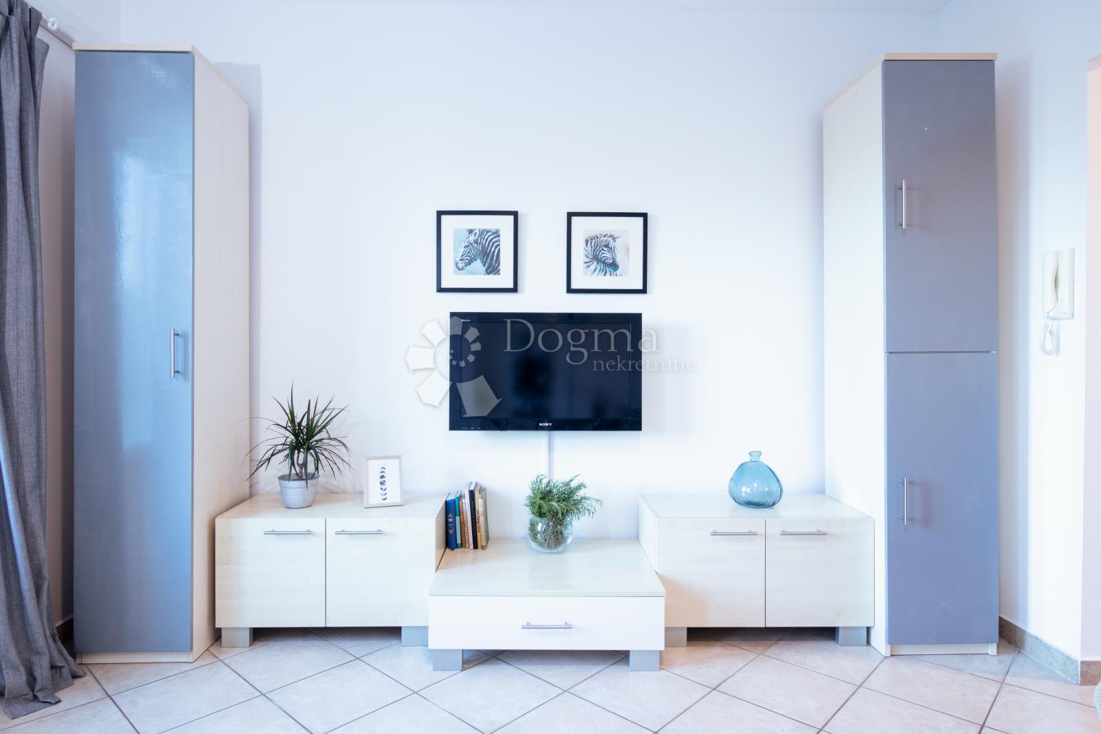 Smještena u prizemlju, etaža je podijeljena u tri zasebna stana (2S+DB, 1S+DB i studio), svaki s izlazom na terasu i okućnicu. Sve su jedinice etažirane i imaju svoj vlasnički list. U sklopu objekta nalazi se i konoba, trenutno uređena kao studio apartman — što omogućava ukupno četiri zasebne jedinice. Po želji kupca, moguće ih je spojiti u jedan veliki stan. I taj prostor je legaliziran.