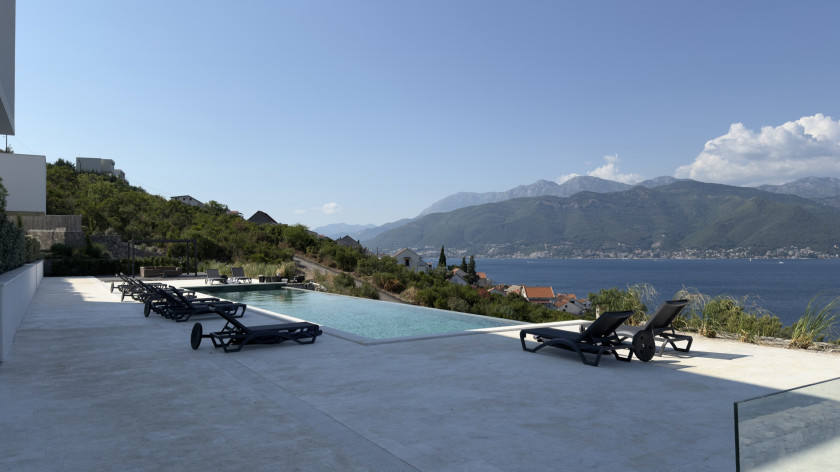 Velike panoramske staklene površine pružaju spektakularan pogled na more i okolne planine.
