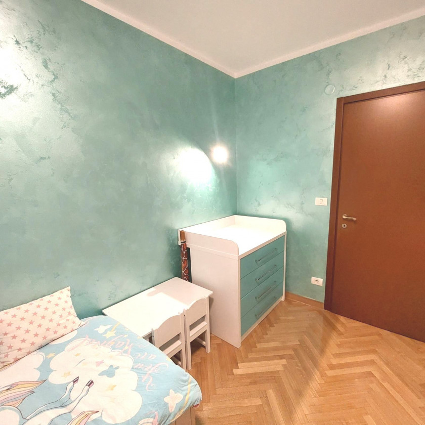 Luxuriously equipped, bright and vivid colors, high quality furniture, kitchen made of high-gloss MDF (Bosch technics) highest quality built-in sliding wardrobes 8m long in total. Living room equipped with expencive modern comfortable sitting furniture, smart TV, MDF high-gloss furniture, art paintings. The bathroom is thoroughly equipped with high-glass MDF elements and direct-drive LG washing machine. Garden set on the terrace for relaxation on west oriented terrace. East terrace is glass closed - equipped with drying machine and huge modern 7-draver freezer.