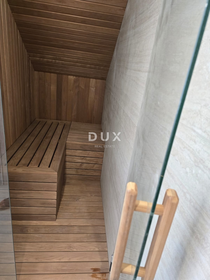 Unutarnji raspored je pažljivo osmišljen – donji kat čini prostrani dnevni boravak u open space konceptu s blagovaonicom i kuhinjom po mjeri opremljenom Electrolux aparatima, a tu je i privatna wellness zona s finskom saunom, tušem i dodatnim WC-om. Na katu se nalaze dvije spavaće sobe s portugalskim plutanim podovima, svaka s vlastitom en-suite kupaonicom.