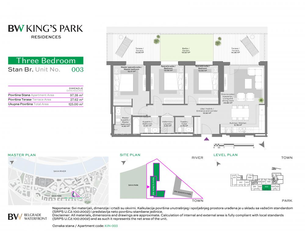 Opis: Vanredna prilika za poslovni ili stambeni prostor sa baštom u u BW. Predstavljamo vam vrlo lep i funkcionalan stan u novoj zgradi BW- King's Park. Odličan za poslovni prostor, orijentisan ceo ka Savskom parku. Sastoji se od: ulaznog hodnika, dnevne sobe sa direktnim izlazom na terasu, trpezarije i kuhinje,tri spavaće sobe od kojih je jedna master soba sa terasom od 13,26 m2, vešernice, tri kupatila i bašte od 14,52m2 ušuškane između dve terase.