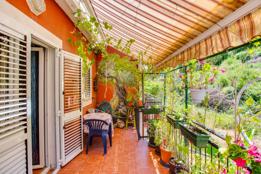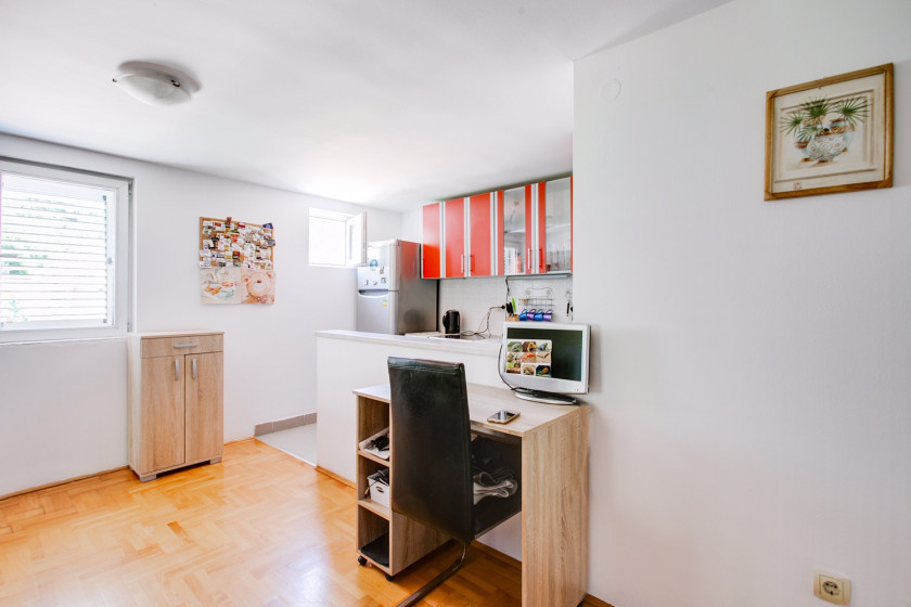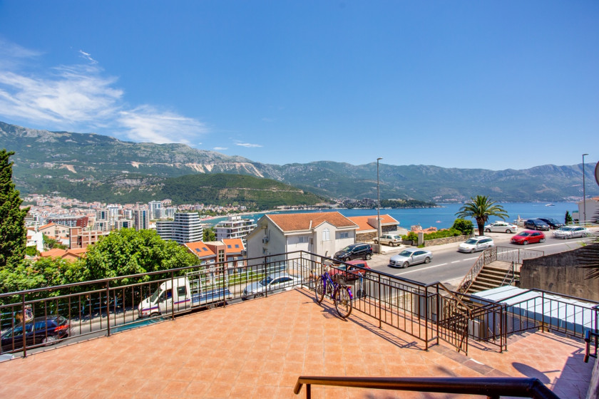 Stan se nalazi na 5. spratu (potkrovlju), a prozori su orijentisani u pravcu suprotnom od puta. Ukupna površina stana je 82m2, uključujući terasu površine 15m2. Raspored: prvi nivo - dnevni boravak sa kuhinjom, kupatilo, terasa; drugi nivo - dve spavaće sobe, kupatilo sa tuš kabinom. Pogled sa terase na planinski pejzaž i panoramu Budve.