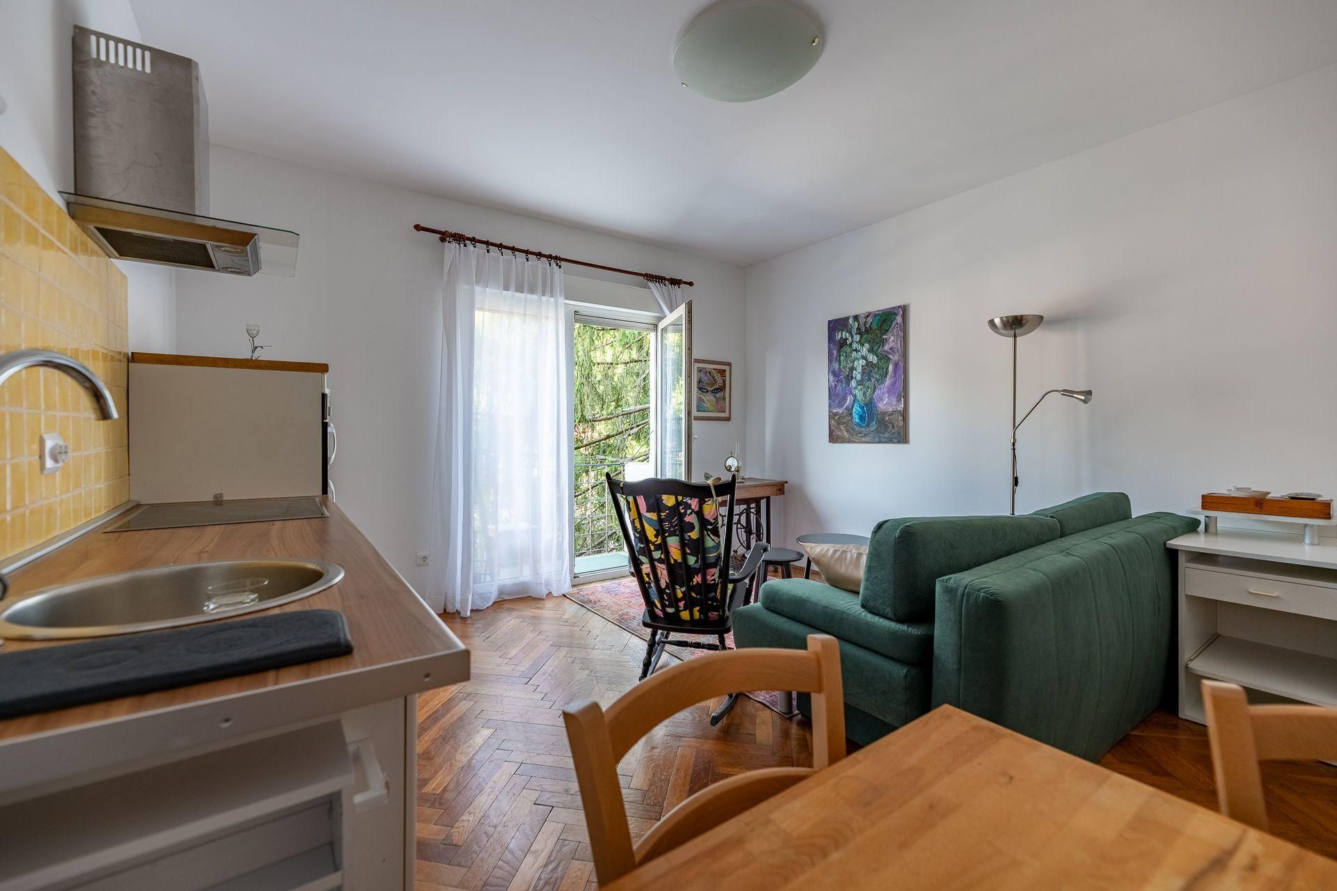 Vrlo lijep i ugodan jednosoban stan površine 40 m² smješten je na drugom katu zgrade izgrađene 1940. godine. Na vlasničkom listu površina stana iznosi 35,8 m², no zahvaljujući dobro osmišljenoj adaptaciji dobiveno je nekoliko dodatnih kvadrata.