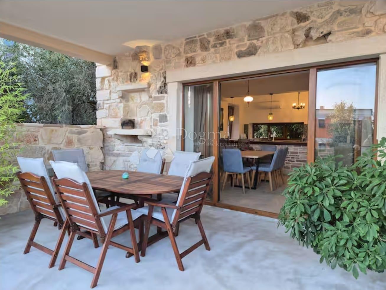 U prizemlju se nalazi veliki dnevni boravak s kaminom i kupaonicom, potpuno opremljena kuhinja s blagovaonicom te izlaz na natkrivenu terasu, idealnu za druženja i uživanje na otvorenom.