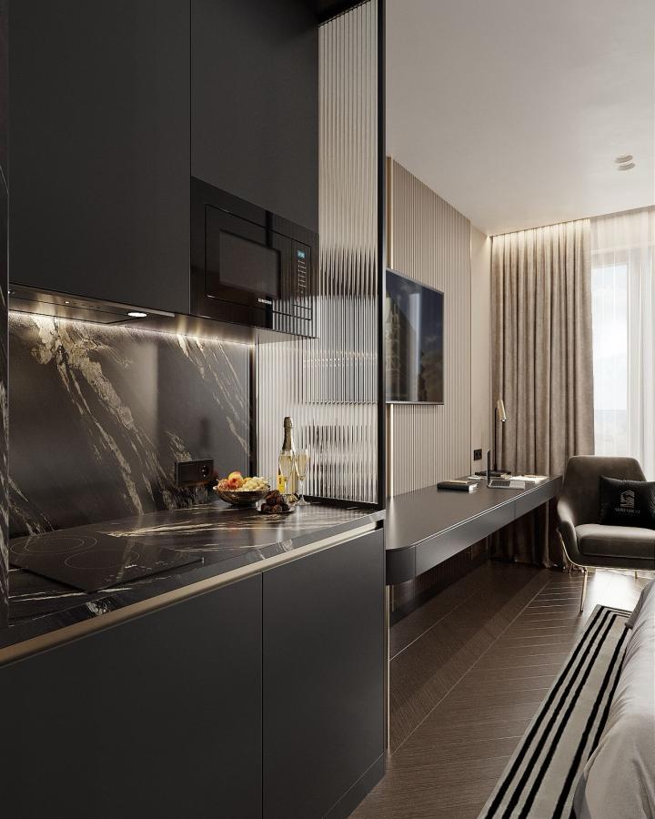 By choosing an apartment in this development, you gain access to a designer lobby, underground parking, fitness area, yoga space, and a swimming pool.