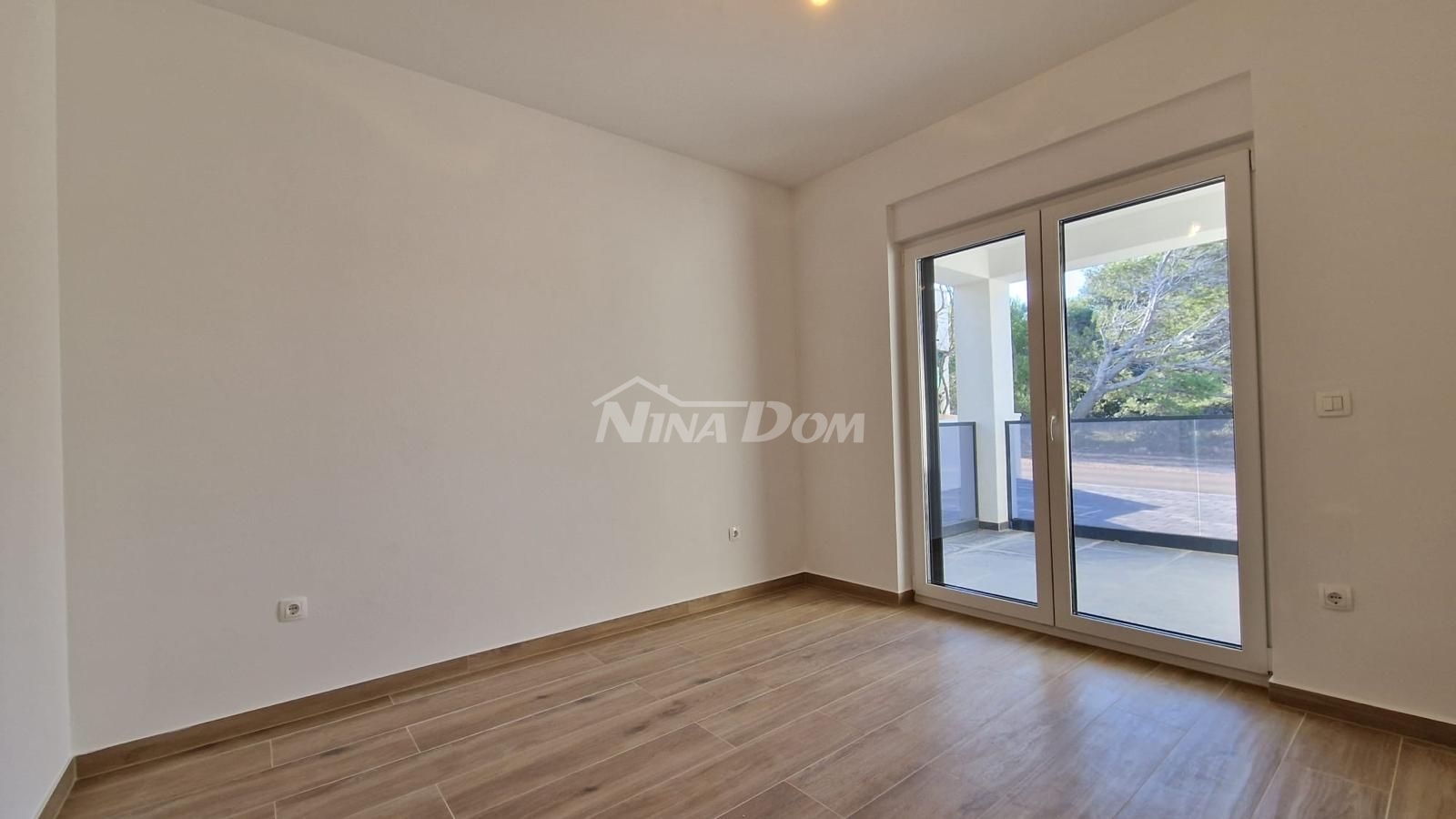 Opis: Novogradnja na lijepoj i mirnoj lokaciji.Prizemlje: sastoji se od hodnika, kuhinje sa blagovaonicom i dnevnim boravkom, dvije spavaće sobe, kupaonica i dvije terase. Ukupna površina posebnog dijela etažne jedinice u prizemlju iznosi 89.67 m2, Pripadak etažnoj jedinici je i zemljište površine 38,33 m2 i parkirno mjesto površine 12,64 m2,. Od mora i plaže u Prezidi udaljen je 260 metara. Predivan pogled na more i Velebit.Klimatiziran, spojen na gradski vodovod i kanalizaciju.