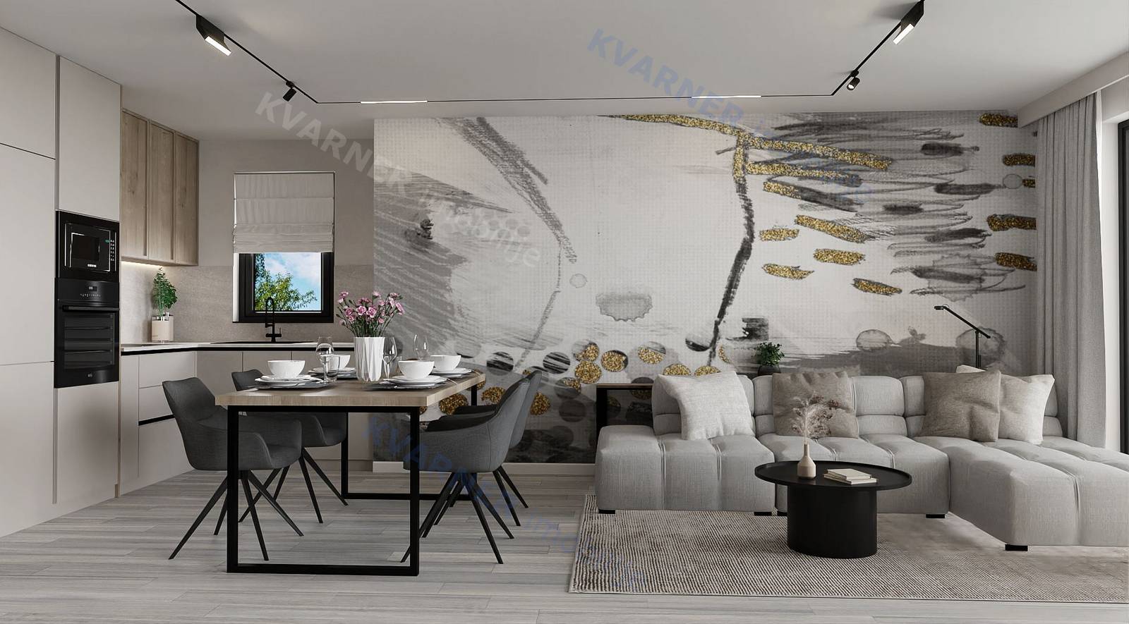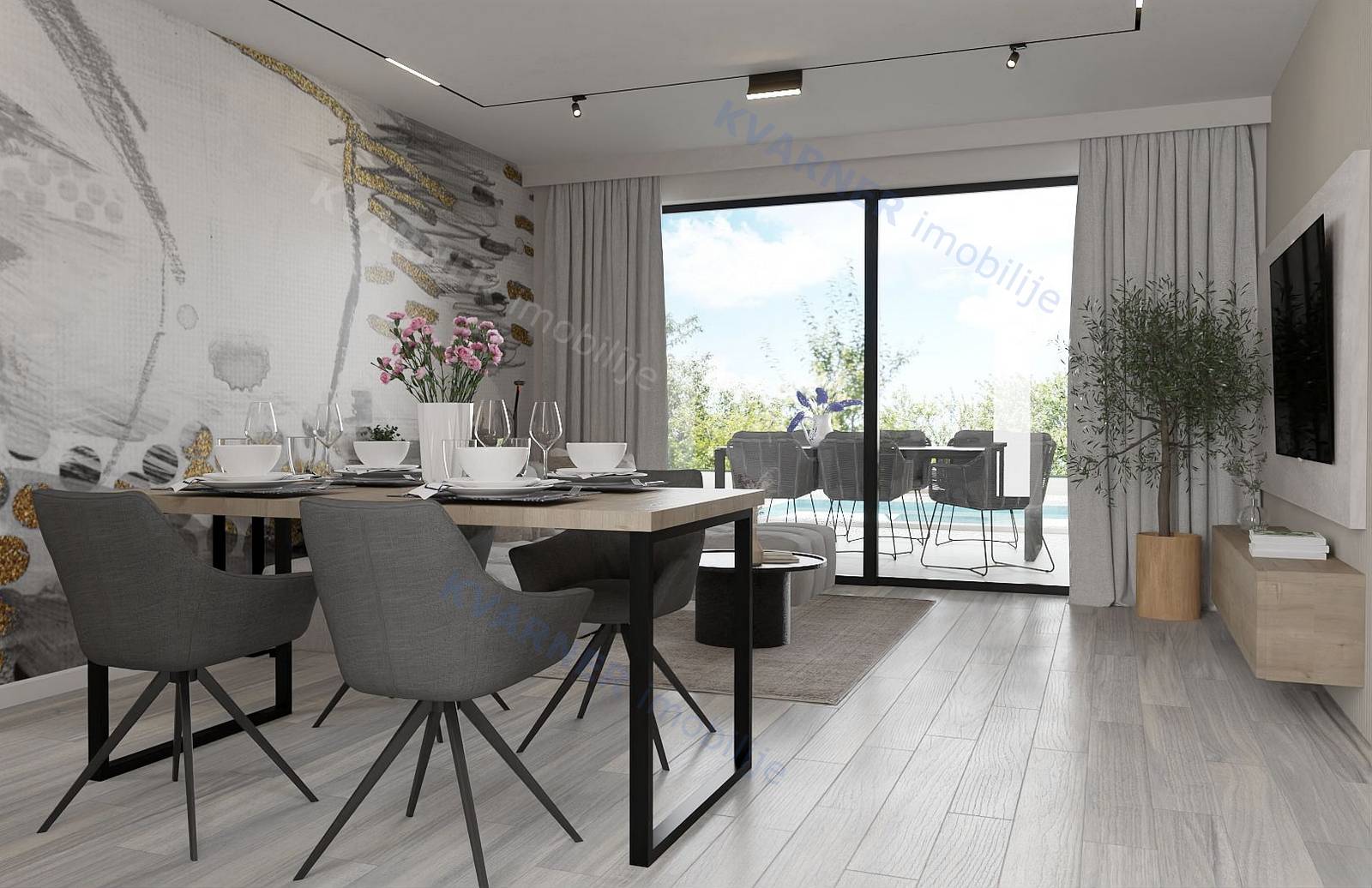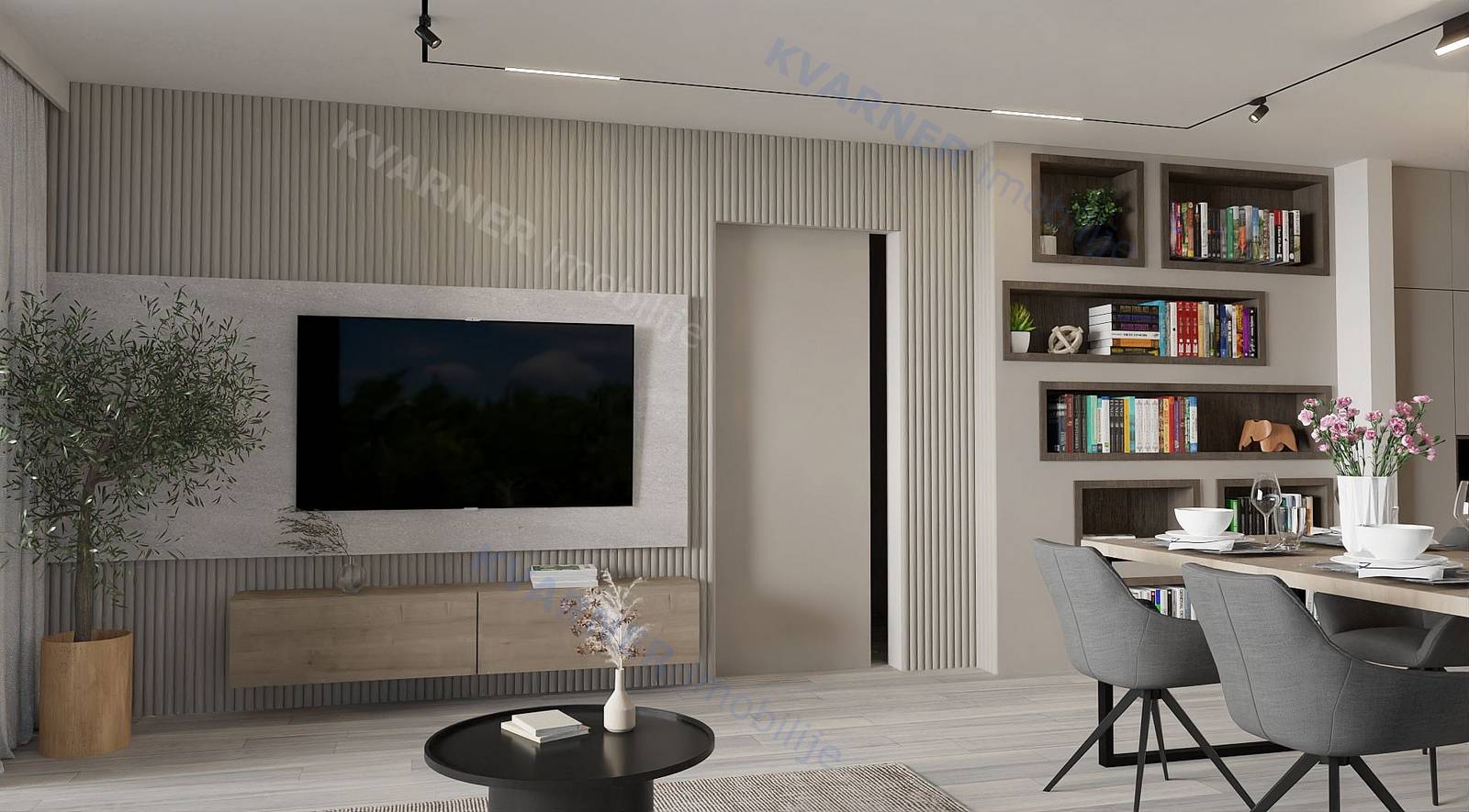 Opis: Prodaje se apartman u prizemlju moderne zgrade u Njivicama, udaljen samo 20 metara od mora. Stan ima 72 m² stambene površine i cca. 100 m² privatnog vrta s bazenom. Sastoji se od ulaznog prostora, dnevnog boravka s kuhinjom i blagovaonicom u open-space konceptu, hodnika, dvije spavaće sobe, WC-a i natkrivene terase s izlazom u vrt.