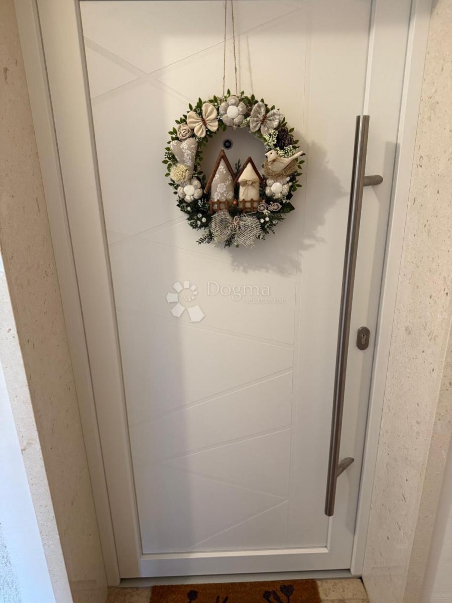 Na donjoj etaži nalazi se ulazni hodnik, kupaonica s WC-om, veliki open space prostor u kojem se nalaze kuhinja, blagovaonica i dnevni boravak, radna soba, ostava, dva balkona te unutarnje stubište koje vodi na drugu etažu. Na gornjoj etaži smještena je spavaća soba, dječja soba, velika kupaonica, manja prostorija s veš mašinom i plinskim bojlerom te hodnik s ugradbenim ormarima.