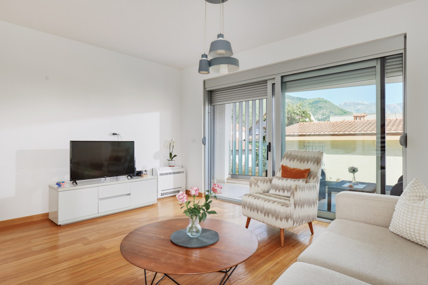 Opis: Moderan i prostran jednosoban stan od 61m², na samo 2min od plaže, i 5 minuta hoda do Porto Montenegra i 4 min hoda od Waikiki plaze. Okružen odličnim restoranima i popularnim plažama, sve na dohvat ruke. Stilizovan enterijer, potpuno opremljena kuhinja, udobna spavaća soba i privatna terasa sa djelimičnim pogledom na more i planine. Max 3 odrasle osobe. Idealan za parove, solo putnike ili digitalne nomade. Wi-Fi i klima uključeni. Stan je na prvom spratu. Zdrada ima lift i video nadzor. Parking mjesto ispred zgrade obezbjedjeno.