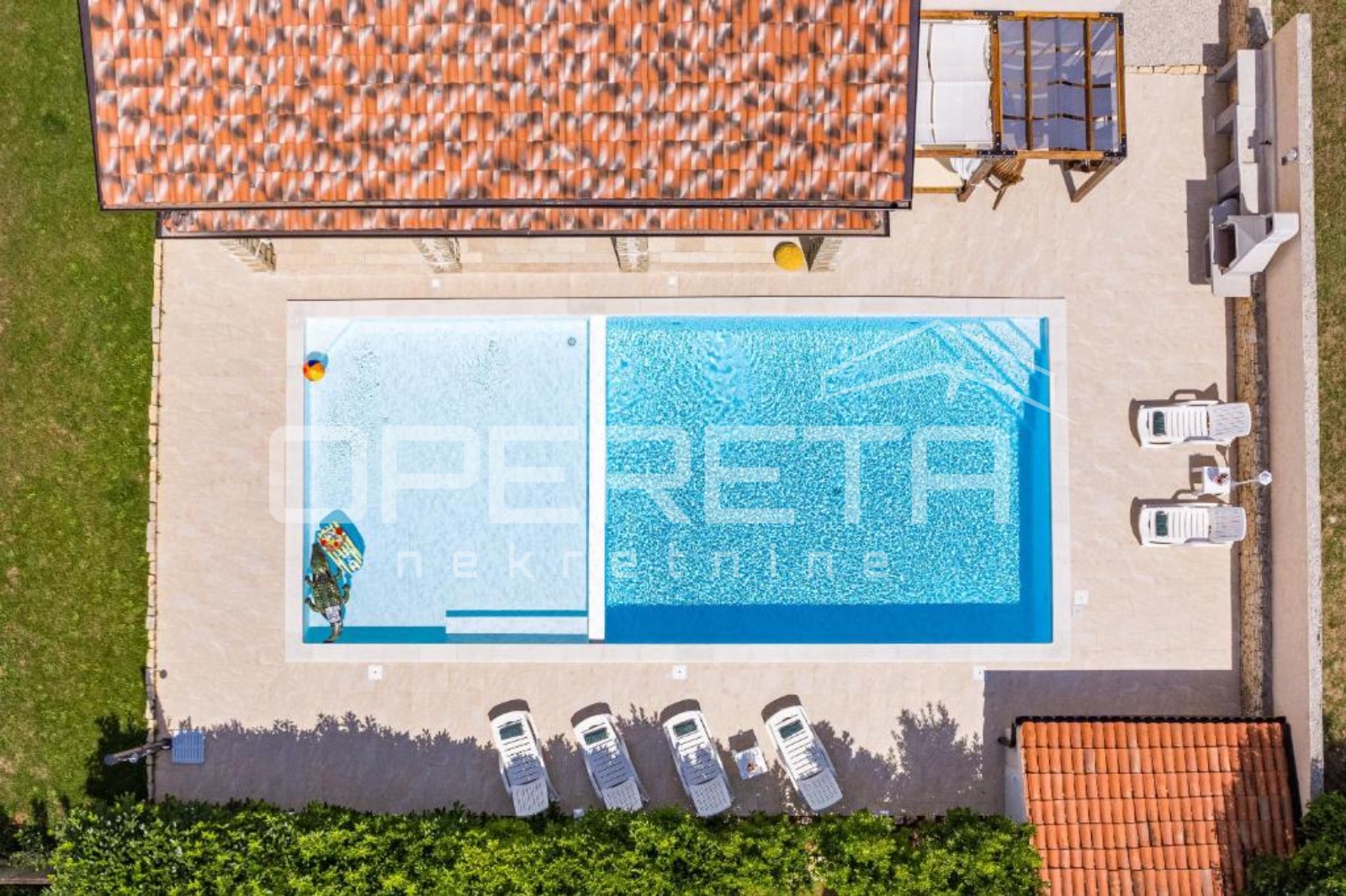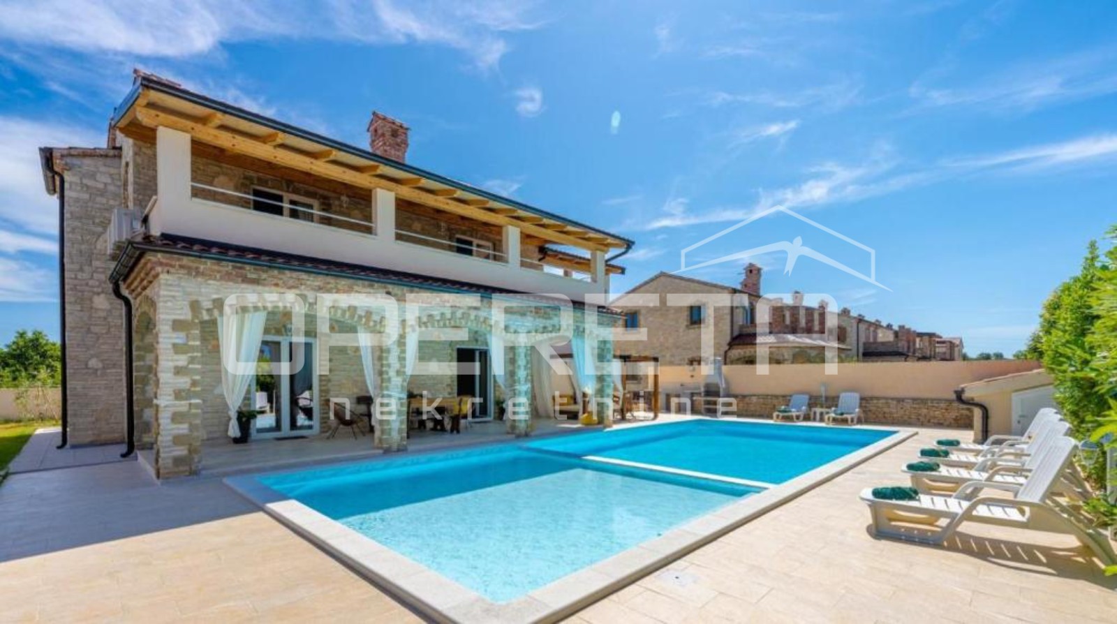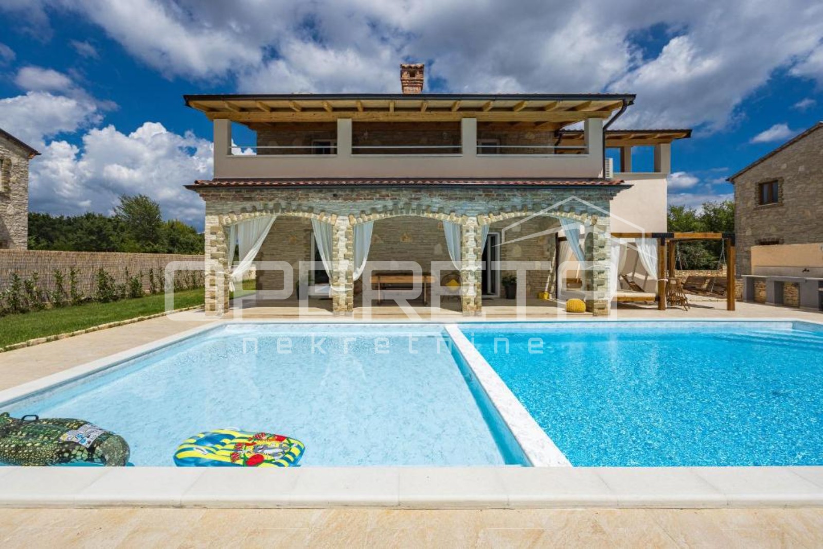 Opis: U srcu mirnog istarskog naselja, okruženog prirodom i kućama za odmor, smjestila se šarmantna kamena kuća izgrađena 2008. godine. Prilaz vodi s asfaltirane ceste, a lokacija osigurava privatnost i udobnost, uz sve što je potrebno za opušten boravak.Kuća se prostire na 170 m² neto površine i zemljištu od 625 m². Tijekom razdoblja od 2022. do 2024. godine pažljivo je adaptirana, a danas se prodaje potpuno namještena i opremljena.Interijer je funkcionalno raspoređen: u prizemlju se nalazi spavaća soba, ostava, kupaonica te kuhinja i blagovaonica povezane s dnevnim boravkom iz kojeg se izlazi na veliku natkrivenu terasu. Na katu su tri spavaće sobe, dvije kupaonice i terase koje pružaju dodatni prostor za opuštanje. Kao poseban dodatak, pored kuće se nalazi zasebna soba s vlastitom kupaonicom i zasebnim ulazom – idealna za goste, ali i prilagodljiva kao fitness zona ili radni prostor.Okućnica je u potpunosti ograđena i uređena, a njezin središnji dio zauzima veliki bazen od 70 m² sa slanom vodom, podijeljen na plići i dublji dio, što ga čini savršenim i za opuštanje i za igru....