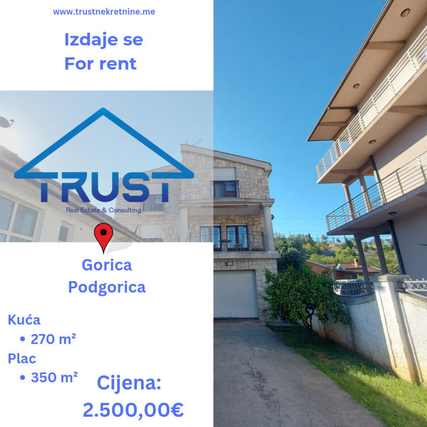 Vrsta: Kuća za Duži Najam Područje: Podgorica Lokacija: Gorica Cijena: €2.500 Spavaćih Soba: 4 Kupatila: 3 Stambena Površina: 270 m2 Zemljište: 350 m2 Parking Mjesta: 5 Klima Uređaj Čuvajte se prevara: NE vršite IBAN uplate