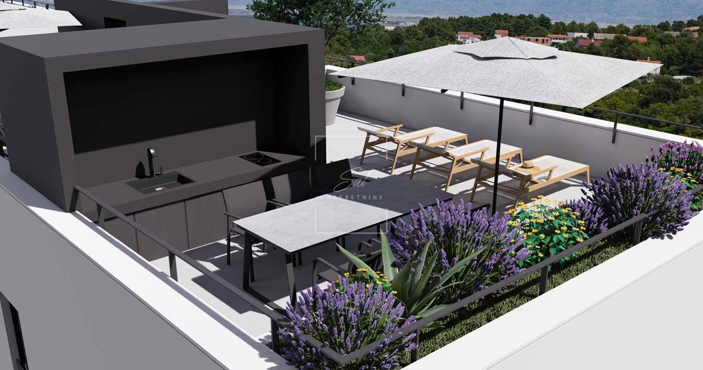 Stanu pripada jedno parkirno mjesto s mogućnošću kupnje dodatnog, natkriveni balkon, kao i krovna terasa od 27,4 m² s predviđenom ljetnom kuhinjom i ljetnim tušem – idealno mjesto za uživanje u suncu, obiteljskim druženjima i ljetnim večerima.