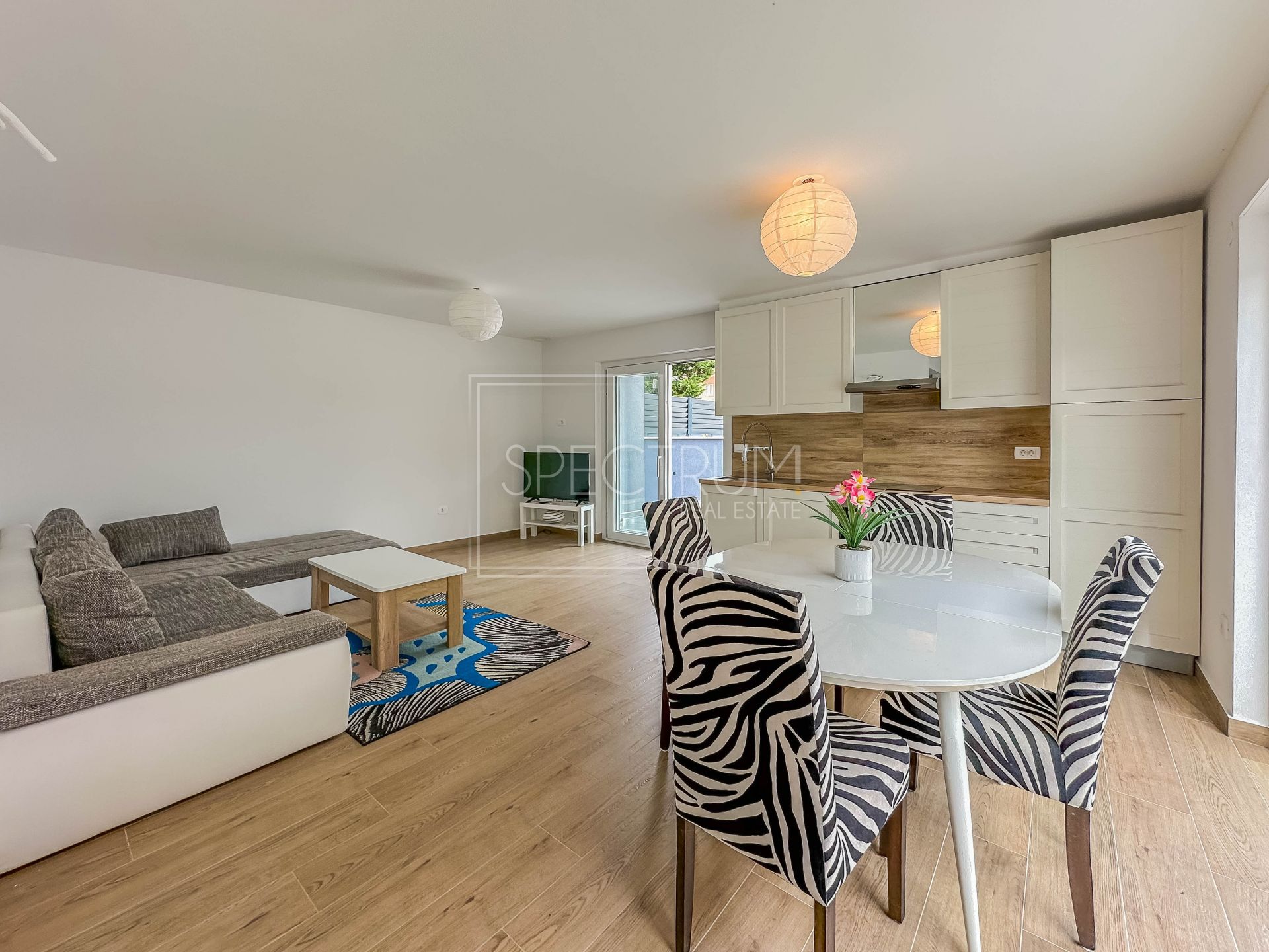 Kuća se proteže na prizemlje i kat, a površina stambenog dijela iznosi 115.04 m2. U prizemlju se nalazi ulazni hodnik, dnevni boravak sa kuhinjom i blagovaonicom open space koncepta, spavaća soba sa vlastitom kupaonicom, wc i ostava. Unutarnjim stepenicama se dolazi do kata gdje se nalazi hodnik te 2 spavaće sobe, svaka sa svojom kupaonicom i sa svojim izlazima na natkrivene terase. Sa jedne terase se pruža pogled na more. Kuća se prodaje namještena. Grijanje je regulirano putem klima uređaja.