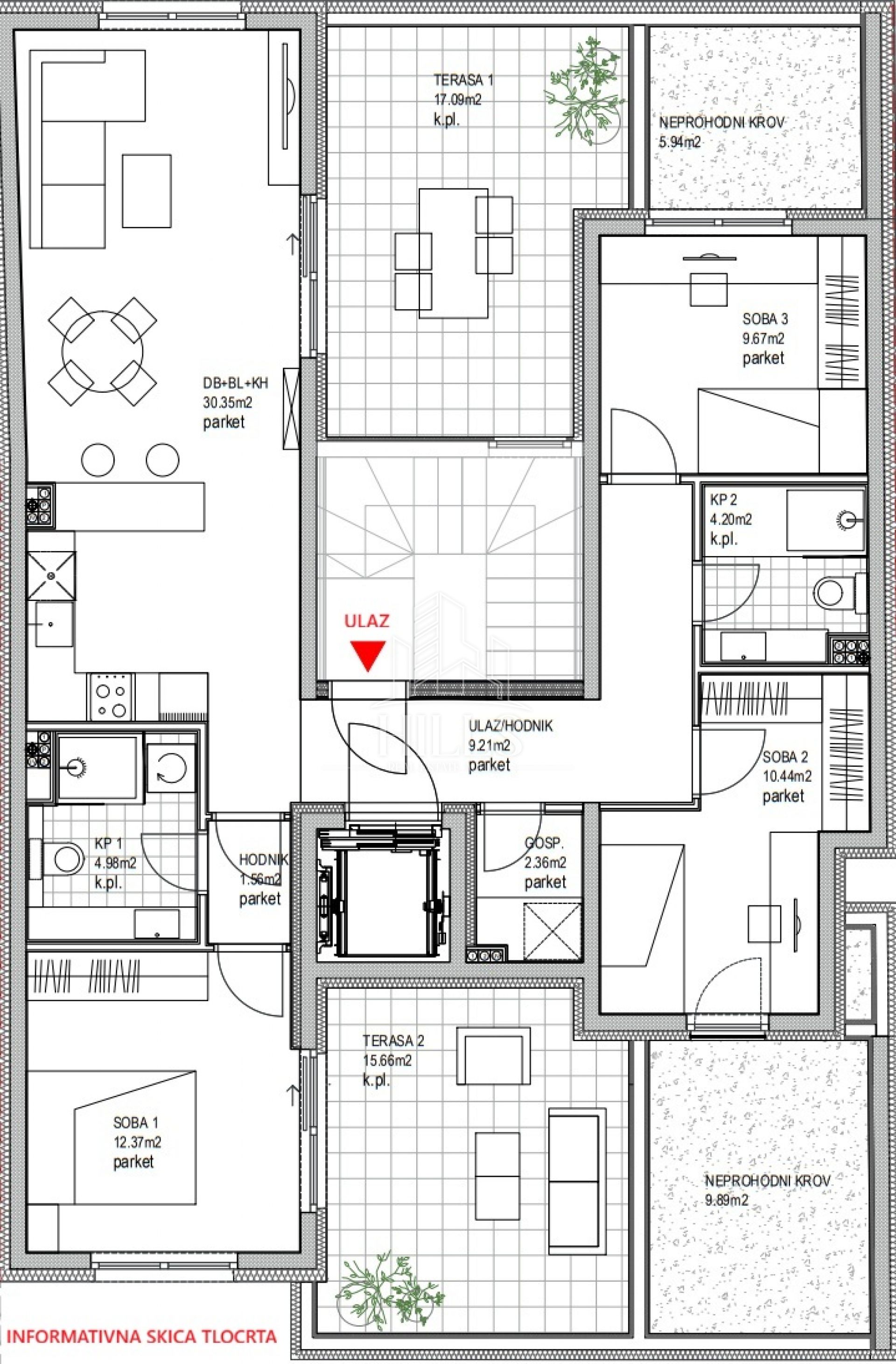 Stan se sastoji od ulaznog prostora, dnevnog boravka s kuhinjom i blagovaonicom, 3 spavaće sobe, 2 kupaonice s wc-om, vešeraja te 2 terase.