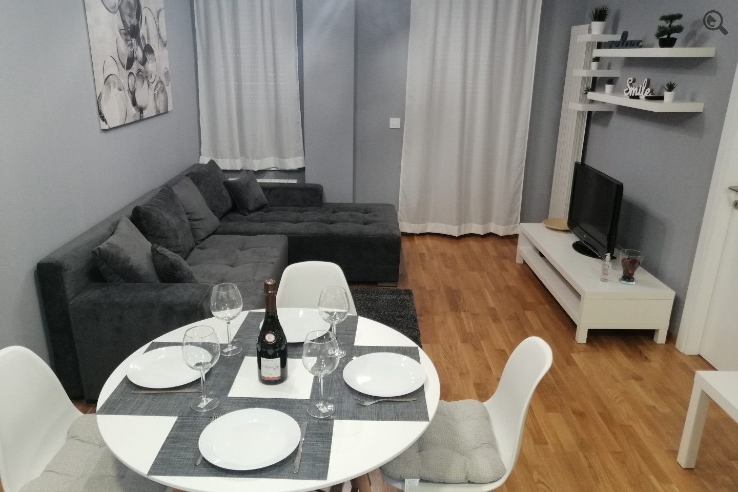 Opis: Apartman Fit se nalazi na Zvezdari u ulici Živka Davidovića, u blizini Istočne kapije Beograda. U neposrednoj blizini apartmana se nalazi i Aviv park Zvezdara. Ovaj apartman je pogodan za boravak do 4 osobe. Apartman ima površinu od 43 m2, i sastoji se od dnevne sobe, odvojene spavaće sobe, kuhinje i kupatila. U spavaćoj sobi se nalazi veliki bračni krevet, kao i orman. U dnevnoj sobi se nalazi ugaona garnitura na razvlačenje. Kuhinja je kompletno opremljena i poseduje sve što vam je potrebno ( frižider, šporet, indukciona ploča, ketler, pribor za ručavanje...). Takođe apartman poseduje i trpezarijski sto i stolice. Kupatilo je takođe kompletno opremljeno i poseduje kadu, veš mašinu, fen za kosu. Dodatna pogodnost ovog apartmana je i terasa koju on poseduje. Gostima su na raspolaganju i WiFi, TV sa kablovskim kanalima, klima uređaj. Za sve goste koji dolaze sopstvenim automobilom, na raspolaganju je i besplatno parking mesto u garaži zgrade. Pušenje u apartmanu je zabranjeno, odnosno dozvoljeno je jedino na terasi, i nikakve žurke i proslave u apartmanu nisu dozvoljene.