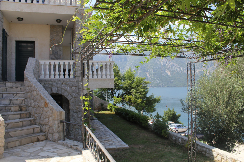 Opis: Na prodaju odlična vila na prvoj liniji mora, površine 235m2 u ekskluzivnom kompleksu Boka Gardens. Vila se nalazi na placu od 494m2, kompletno je opremljena i posjeduje otvoren pogled na Bokokotorski zaliv. U suterenu vile se nalazi konoba, ostava i garaža, na prizemlju su dnevna soba sa kaminom, prostrana kuhinja sa trpezarijom koja izlazi na terasu sa pogledom na more, dok se na pravom spratu nalaze tri spavaće sobe sa svojim terasama i dva kupatila. Postoji mogućnost izgradnje bazena sa morskom vodom 8x4m u dvorištu.
