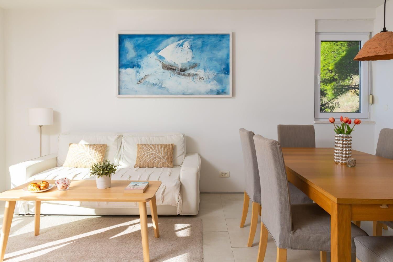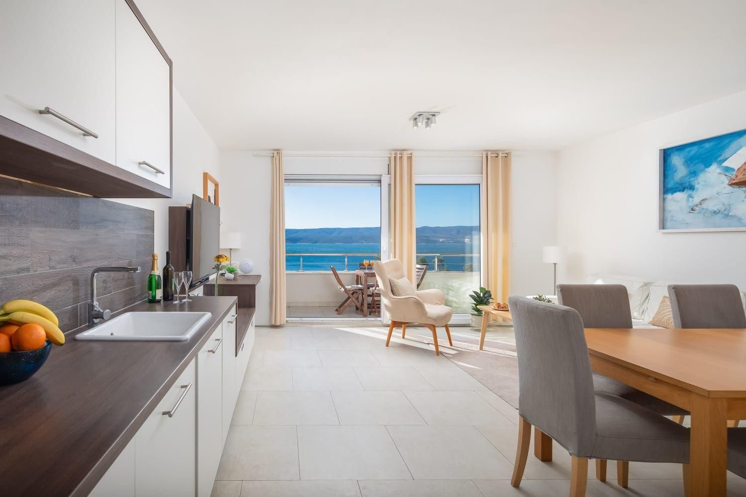 Stan odiše suvremenim dizajnom i udobnošću te je potpuno opremljen i odmah spreman za useljenje. Prostor se sastoji od prostranog dnevnog boravka povezanog s kuhinjom i blagovaonicom iz koje se izlazi na balkon s otvorenim pogledom na more. Dvije spavaće sobe i dvije elegantno uređene kupaonice nude maksimalnu praktičnost i komfor. Glavna spavaća soba ima vlastitu terasu, dok druga soba s dva odvojena kreveta pruža savršeno rješenje za djecu ili goste.