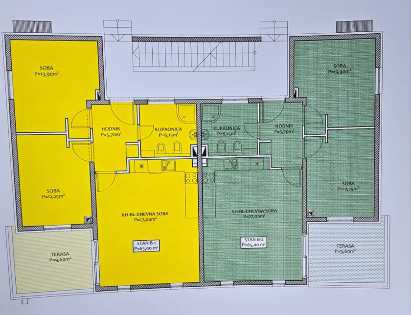 Zgrada ima dva ulaza : po jedan za tri stana.