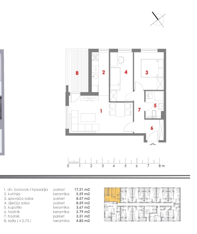 Stan se sastoji od hodnika, dnevnog boravka8 sa kuhinjom i trpezarijom, 2 spavaće sobe, toalet i lođa (x 0.75)