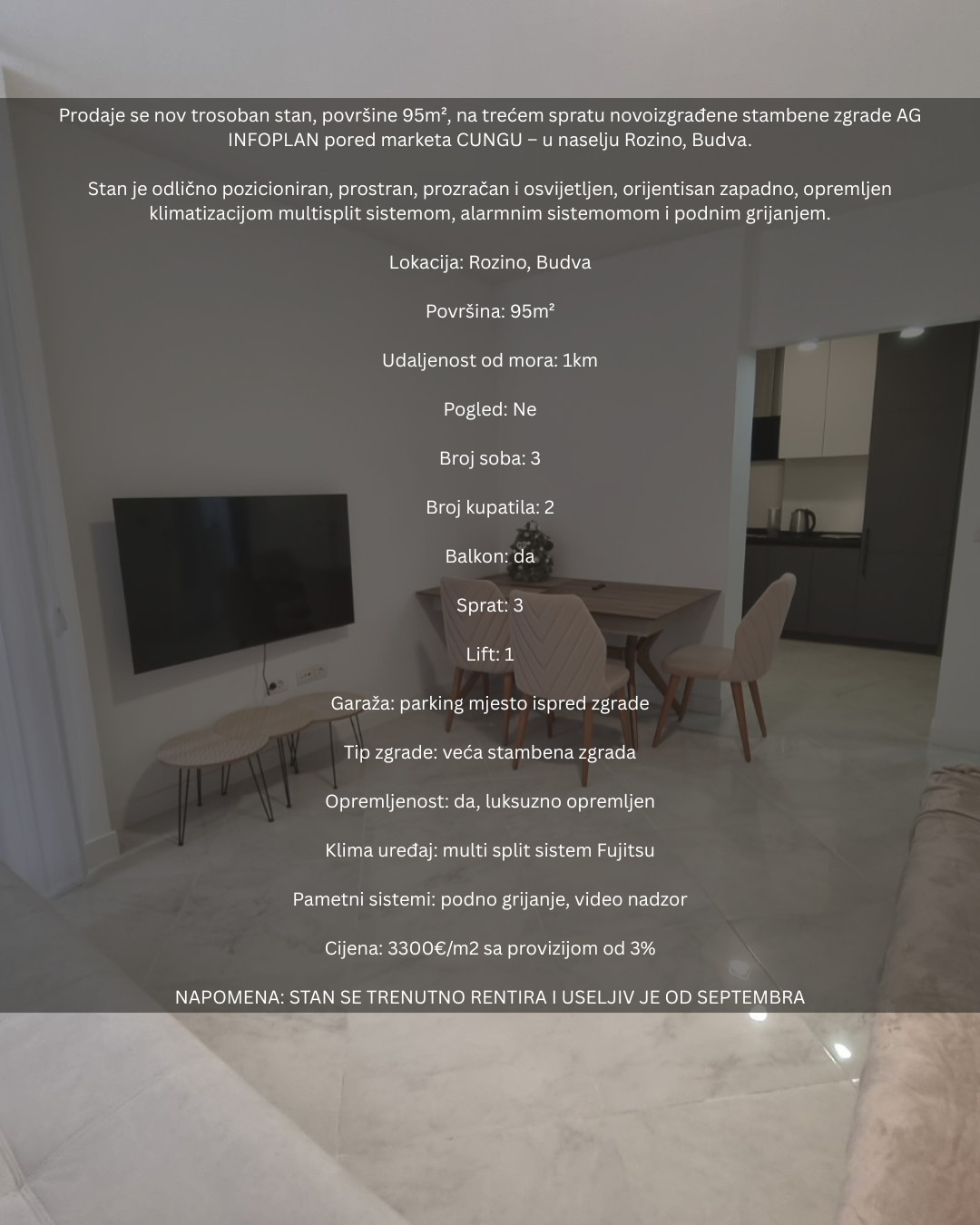 Opis: For sale: New three-bedroom apartment, 95m², on the third floor of a newly built residential building by AG INFOPLAN next to the CUNGU market – in the Rozino neighborhood, Budva. The apartment is excellently located, spacious, airy, and well-lit, facing west. It is equipped with a Fujitsu multisplit air conditioning system, an alarm system, and underfloor heating. Location: Rozino, Budva Area: 95m² Distance from the sea: 1 km View: None Number of rooms: 3 Number of bathrooms: 2 Balcony: Yes Floor: 3rd Elevator: Yes Garage: Parking space in front of the building Registered (property ownership): Yes Building type: Larger residential building Furnishing: Yes, luxuriously furnished Air conditioning: Fujitsu multisplit system Smart systems: Underfloor heating, video surveillance