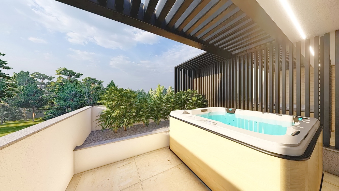 Apartman se prostire na prizemlju, prvom i drugom katu, s ukupnom površinom od 83 m2. U prizemlju se nalazi ulazni prostor, kuhinja s blagovaonicom i dnevnim boravkom, toalet, stubište te terasa s izlazom na vrt. Na prvom katu smještene su dvije spavaće sobe, hodnik, kupaonica i balkon, dok je drugi kat rezerviran za prostranu galeriju s vlastitom kupaonicom i terasom na kojoj je predviđen jacuzzi.
