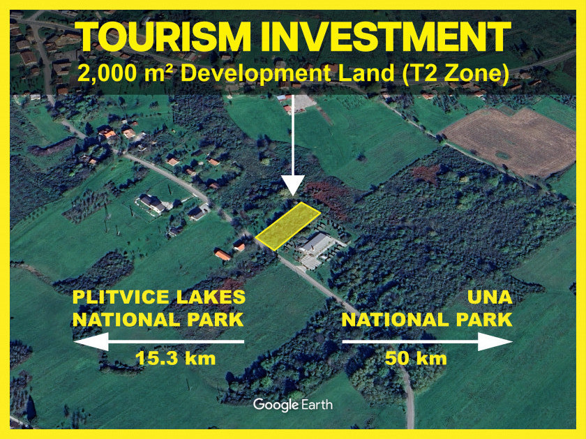 Atraktivno zemljište za turistički razvoj u T2 zoni, samo 15,3 km od Nacionalnog parka Plitvička jezera (1,49 milijuna posjetitelja u 2024.).