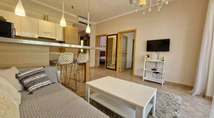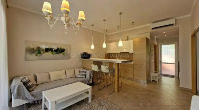 Ulazni hodnik, prostrani dnevni boravak otvorenog koncepta sa potpuno opremljenom kuhinjom i trpezarijom, dvije udobne spavaće sobe i moderno kupatilo.