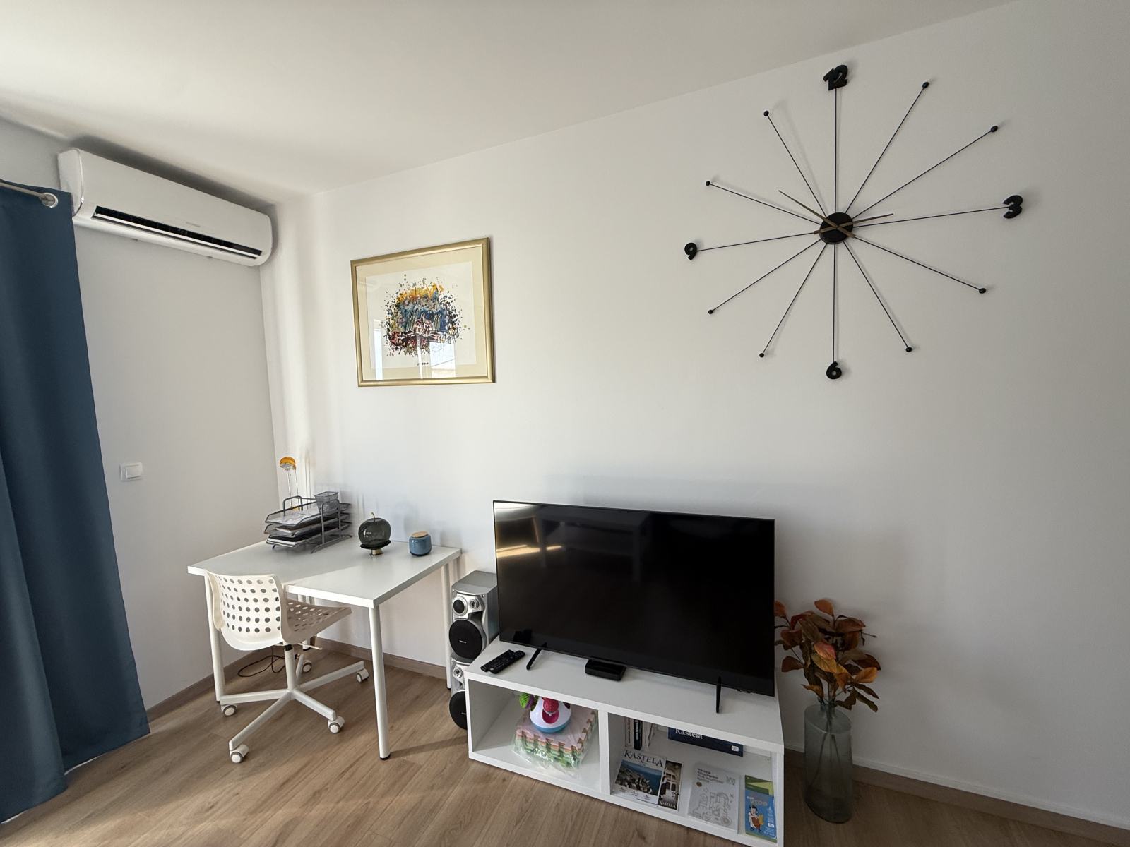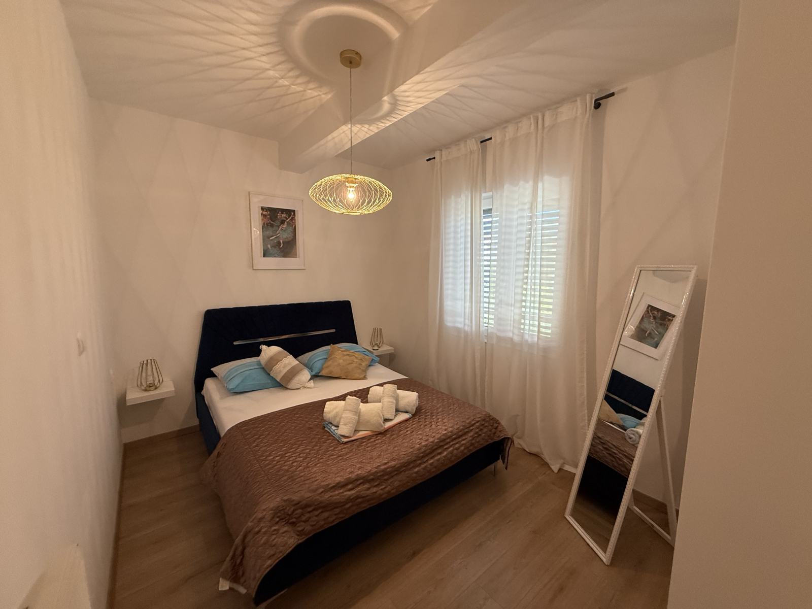 Stan se sastoji od prostranog dnevnog boravka s kuhinjom i blagovaonicom, dvije spavaće sobe i kupaonice.