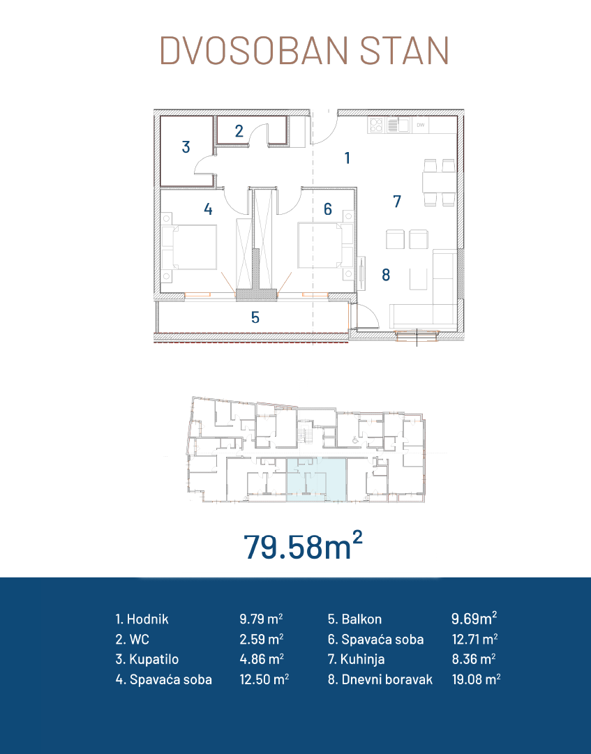 Opis: VI sprat - Dvosoban stan, površine 79,58 m2