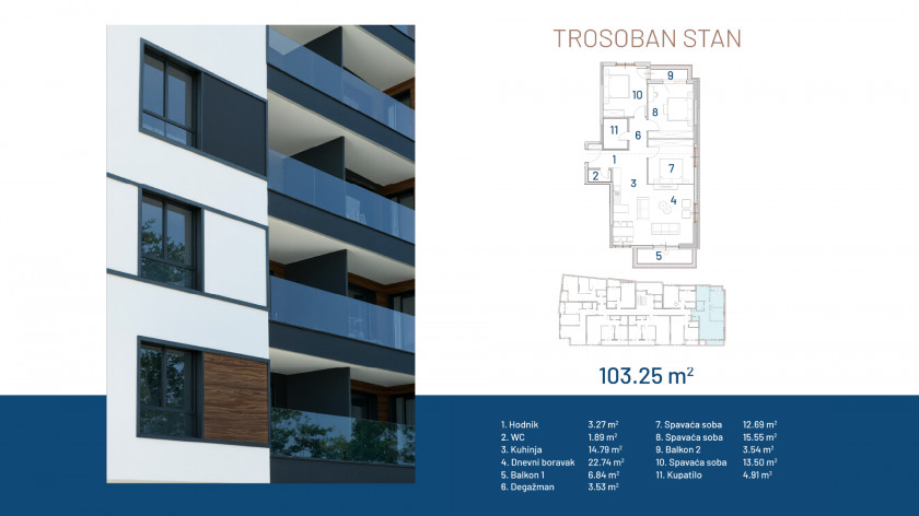 Opis: IV sprat - Trosoban stan, površine 103,25 m2